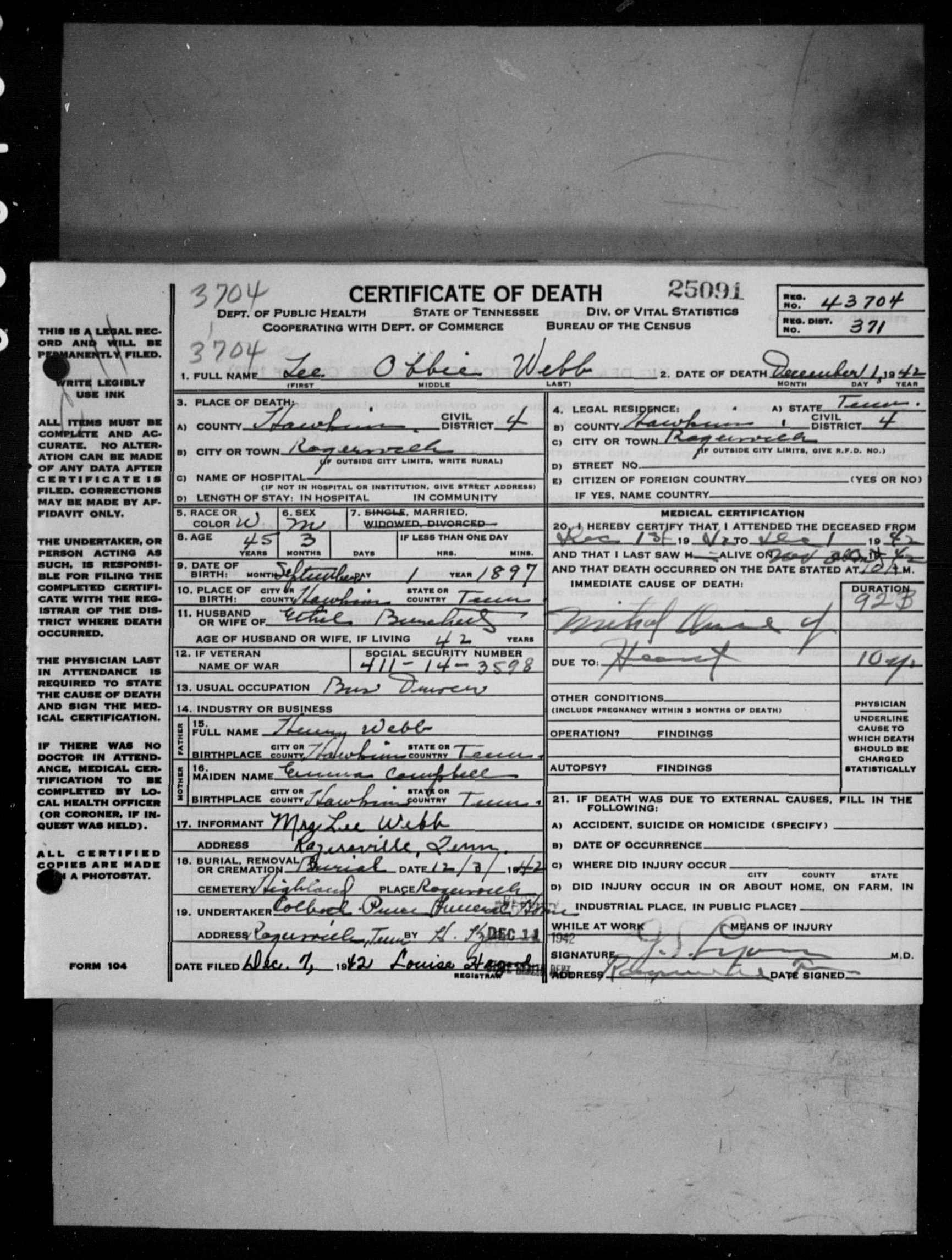 6857. Lee Obbie Webb, “Tennessee Death Records, 1914-1955,” Rogersville, Hawkins County, TN, USA, 25091, microfilm, Digital Folder Number: 004184482-Image Number: 00102-GS Film number: 1876917-Reference ID: vl-cn 25091, https://familysearch.org/pal:/MM9.1.1/NSPR-CCF.