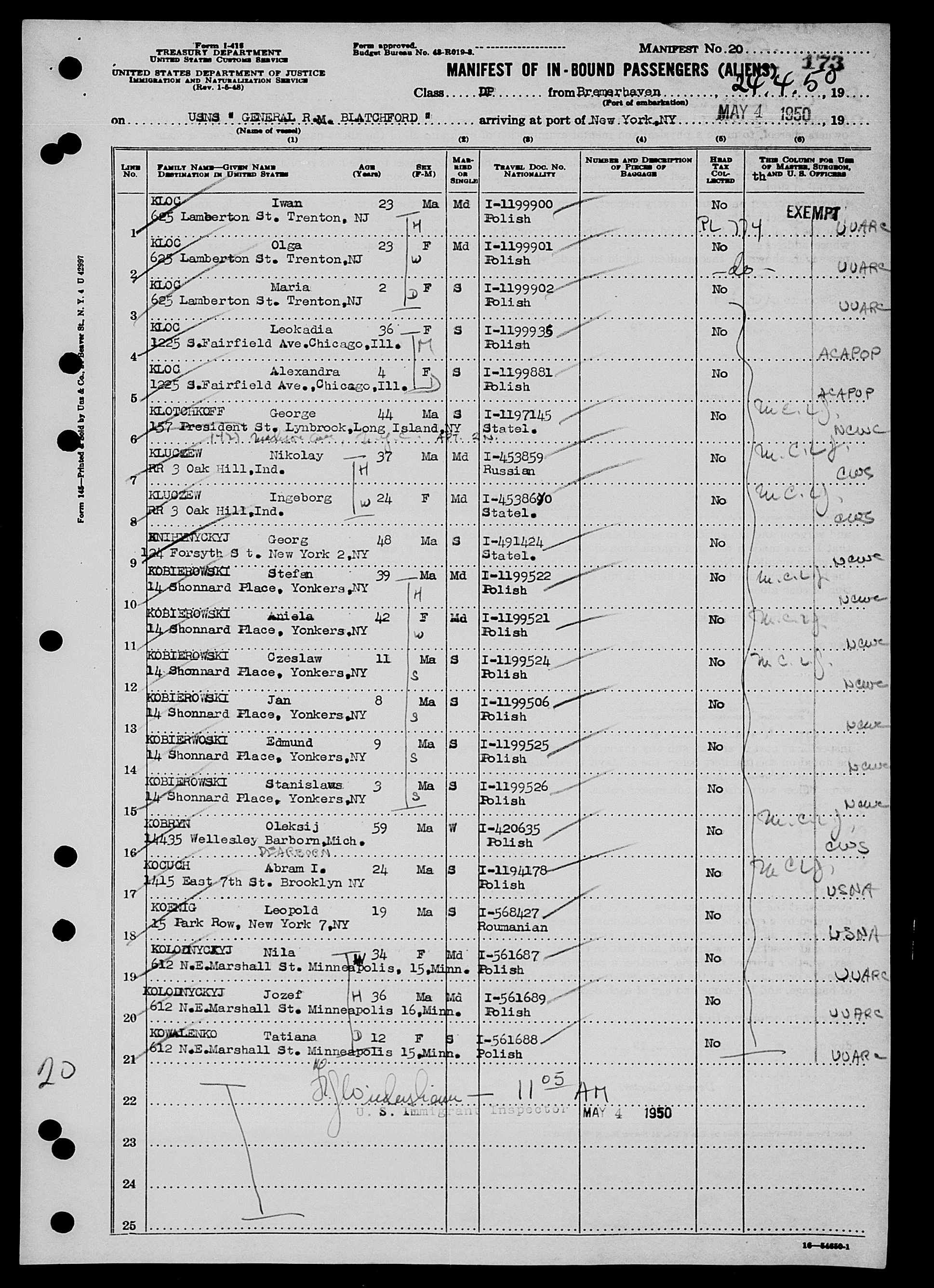 6863. “Manifest of In-Bound Passengers (Aliens),” USNS General R. M. Blatchford from Bremerbavan, “New York, New York Passenger and Crew Lists, 1909, 1925-1957,” May 4, 1950, New York, NY, https://www.familysearch.org/ark:/61903/1:1:24T4-W26.