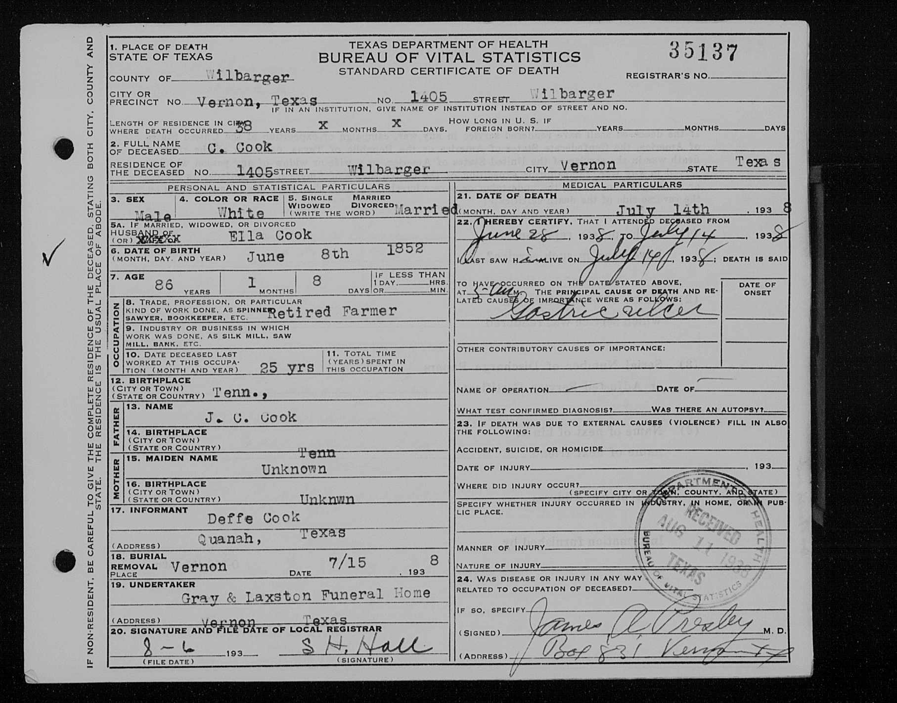 6868. C Cook, “Texas Deaths, 1890-1976,” July 14, 1938, Vernon, Wilbarger County, TX, https://familysearch.org/ark:/61903/1:1:K3MH-63X.