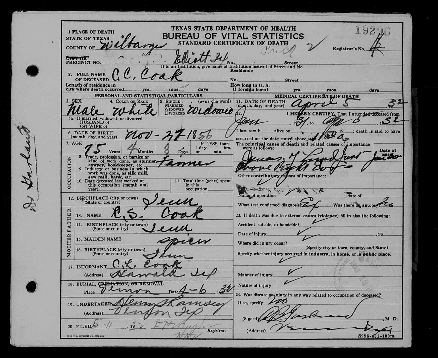 6871. C C Cook, “Texas Deaths, 1890-1976,” April 5, 1932, Elliott, Wilbarger County, TX, https://familysearch.org/ark:/61903/1:1:K332-M2N.