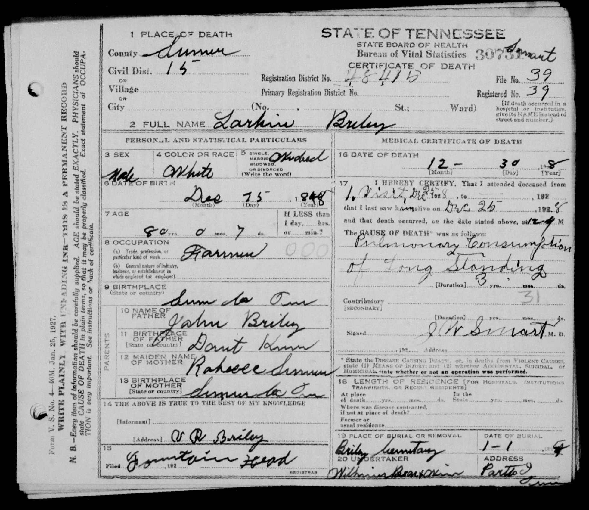 6874. Larkin Briley, “Tennessee, Death Records, 1914-1955,” December 30, 1928, microfilm, Digital Folder Number: 004183612-Image Number: 00737-GS Film number: 1876747-Reference ID: cn 30731, https://familysearch.org/pal:/MM9.1.1/NS5V-KX3.