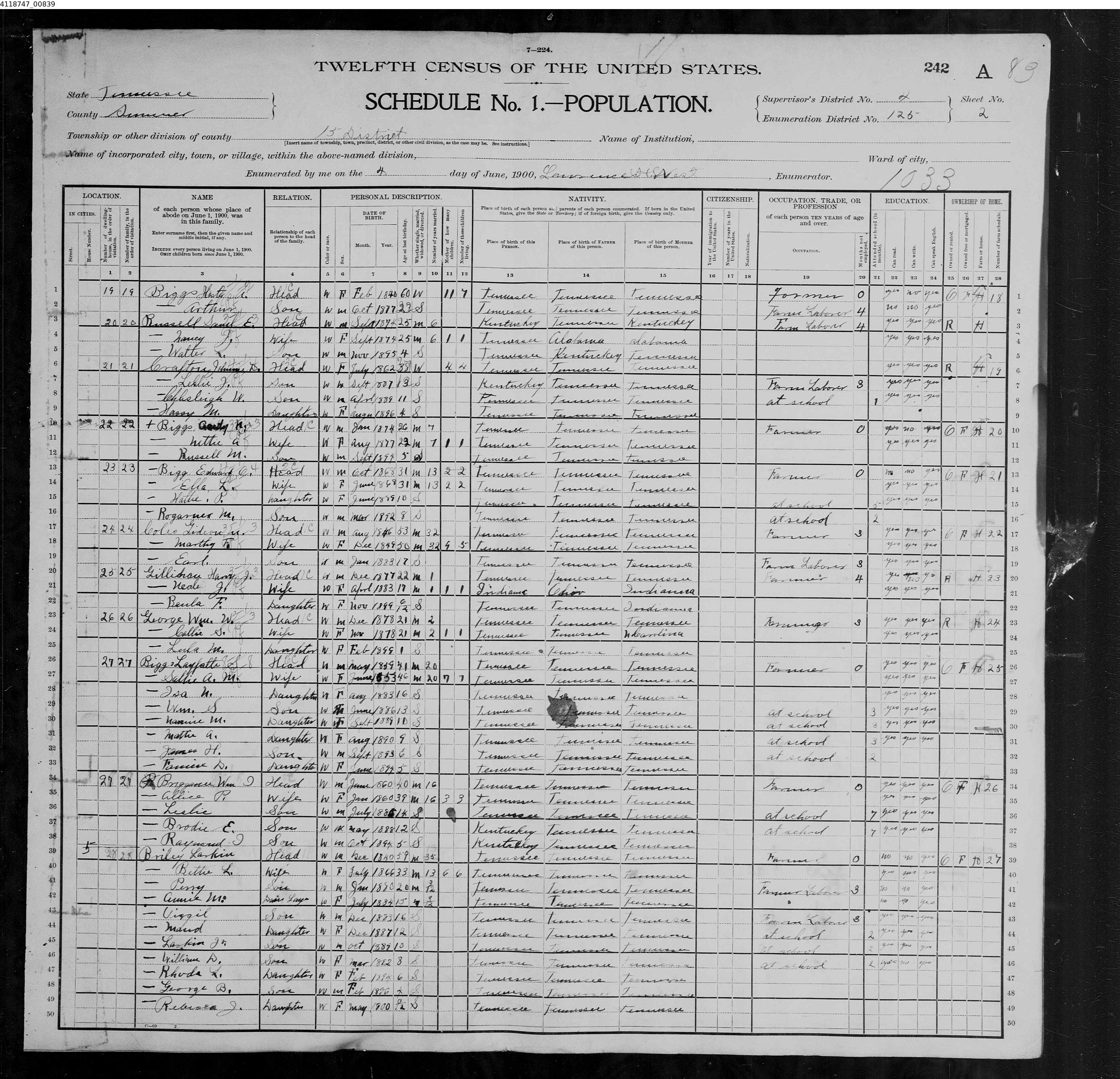6875. “United States Census,” 1900, TN, Sumner, District 15, 2A, 4, 125, T623, 1601, 241, Bureau of the Census, US Dept. of Commerce, United States of America, June 4, 1900, Lawrence H West.