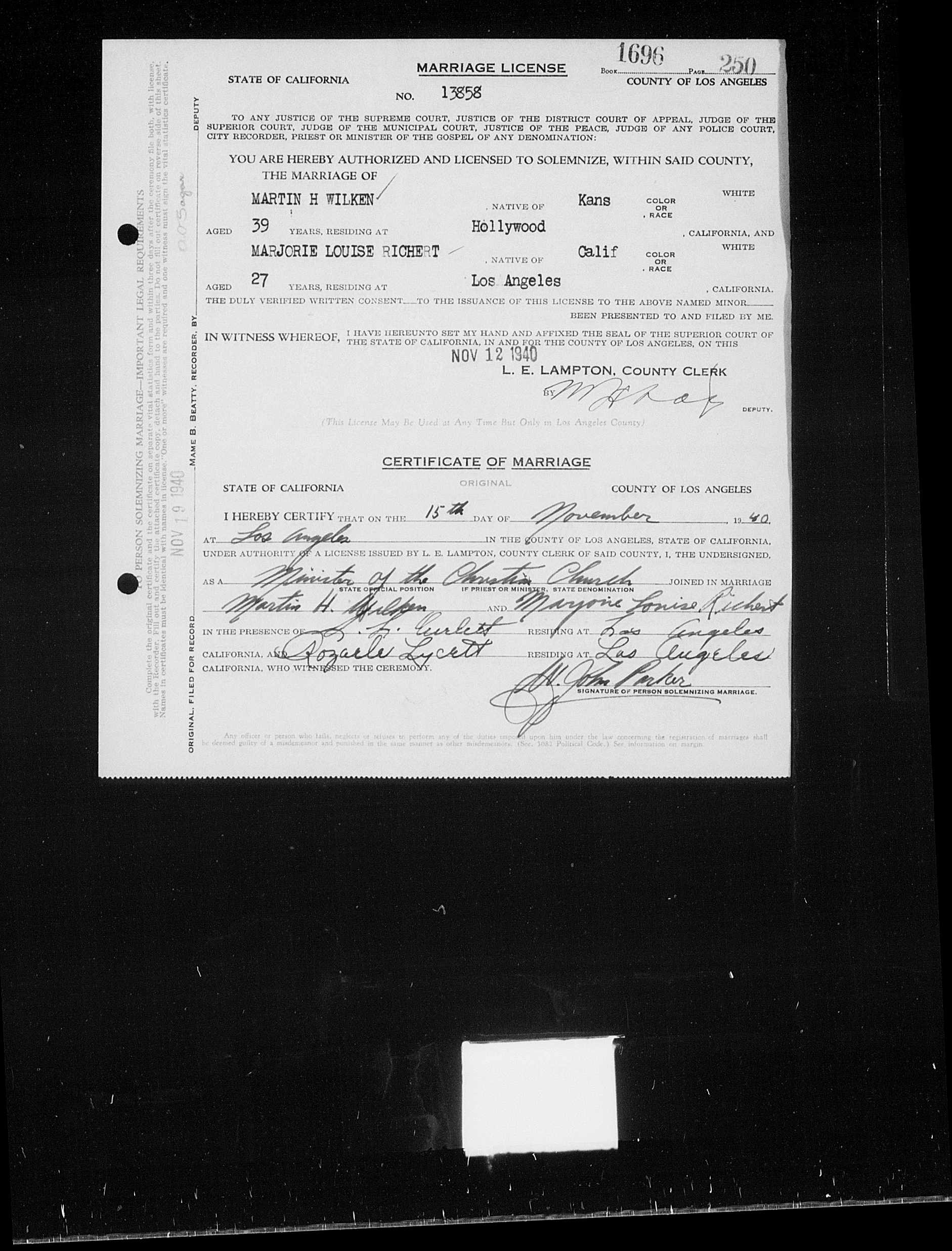 6890. “California, County Marriages, 1850-1952,” Martin H Wilken and Marjorie Louise Richert, November 15, 1940, Los Angeles, Los Angeles County, CA, USA, Page: 250-GS Film number: 2114460-Digital Folder Number: 005698655-Image Number: 01110, https://familysearch.org/pal:/MM9.1.1/K8VN-TSN.