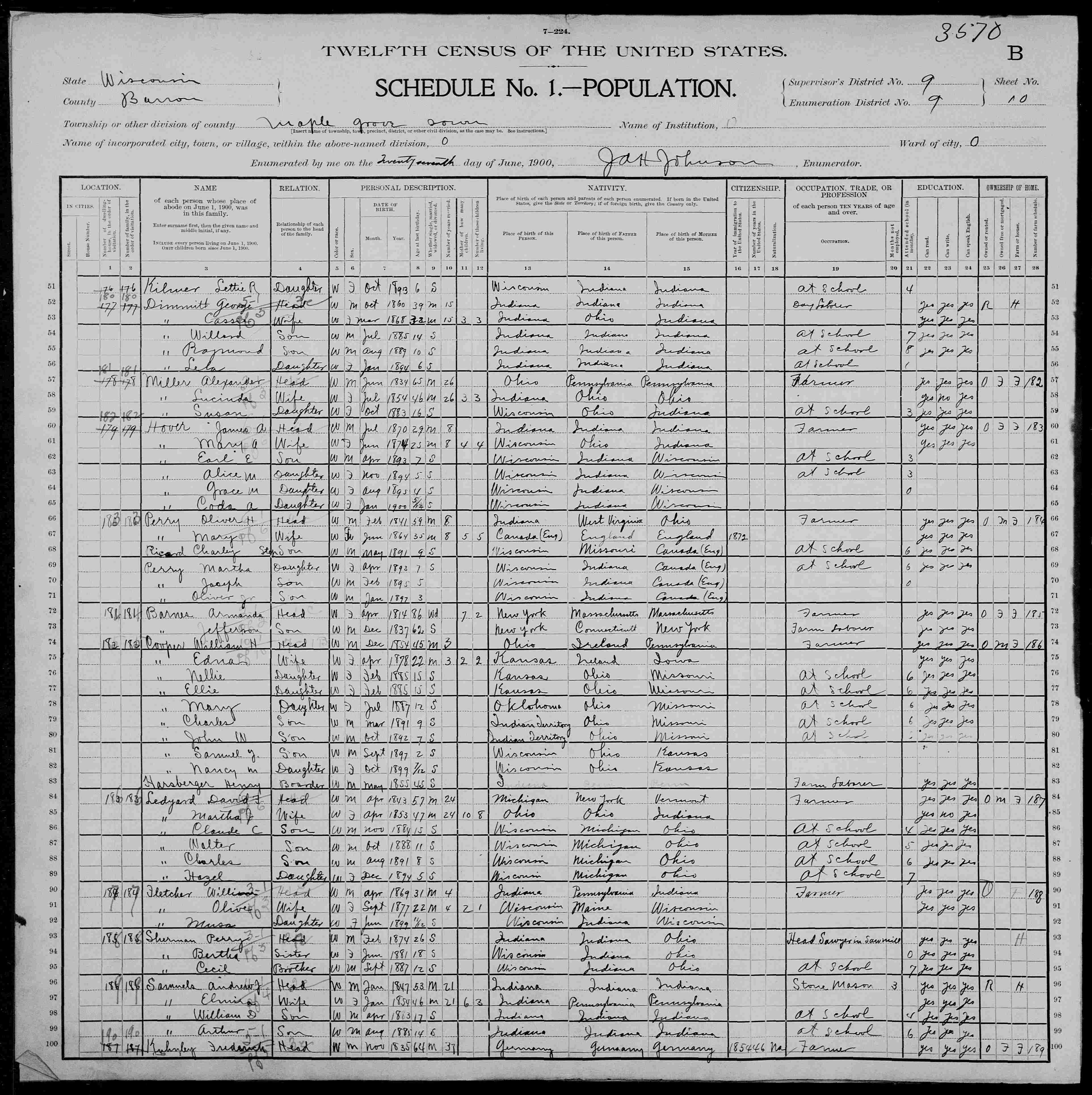 7020. “United States Census: 1900,” Bureau of the Census, US Dept. of Commerce, United States of America, 1900, WI, Barron, Maple Grove, June 27, 1900, James H Johnson, 10B, 9, 9, T623, 1777, 140, 935, Names him as Samuel Y.