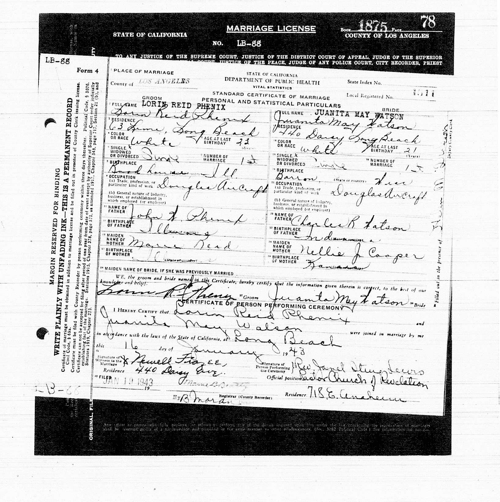 7003. Lorin Reid Phenix and Juanita May Watson, “California, County Marriages, 1850-1952,” January 16, 1943, Long Beach, Los Angeles County, CA, https://familysearch.org/ark:/61903/1:1:K826-XKH.