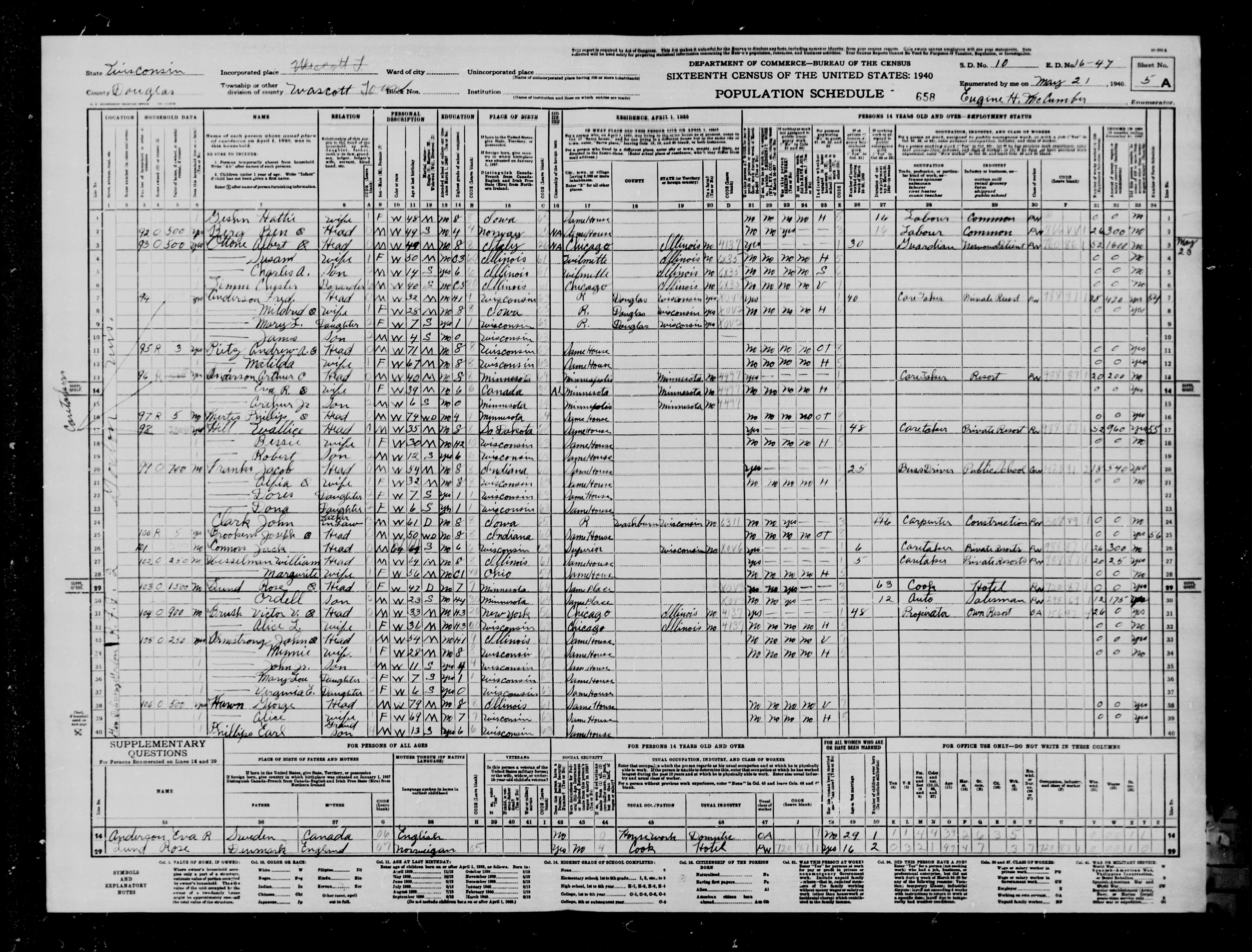 7010. “United States Census,” 1940, WI, Douglas, Wascott, 5A, 10, 16-47, T627, 4475, 1026, Bureau of the Census, US Dept. of Commerce, United States of America, May 21, 1940, Eugine H McCumber.