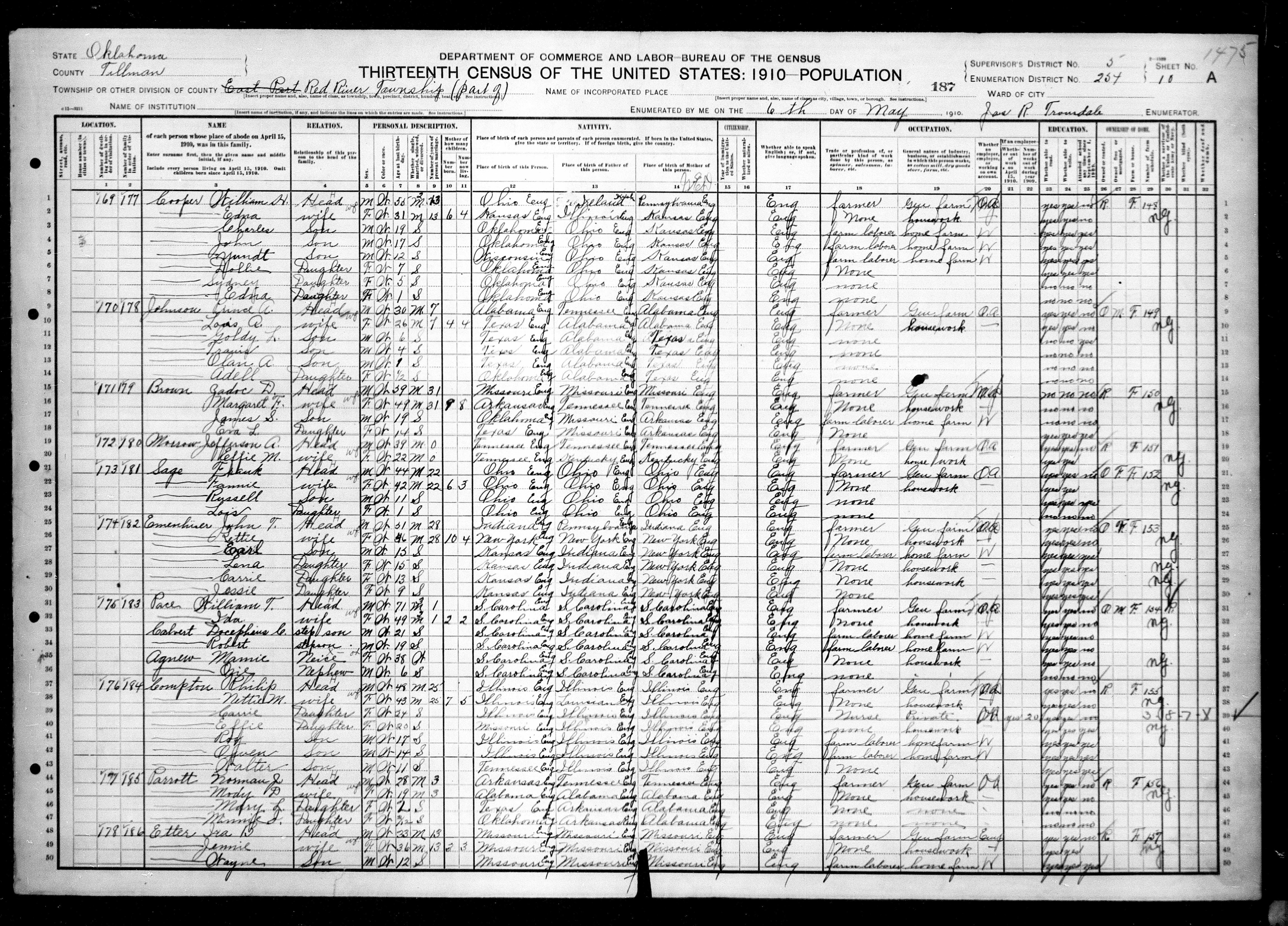 7015. “United States Census,” 1910, OK, Tillman, Red River, 10A, 5, 254, T624, 1275, 1071, Bureau of the Census, US Dept. of Commerce, United States of America, May 6, 1910, Jas R Trousdale.