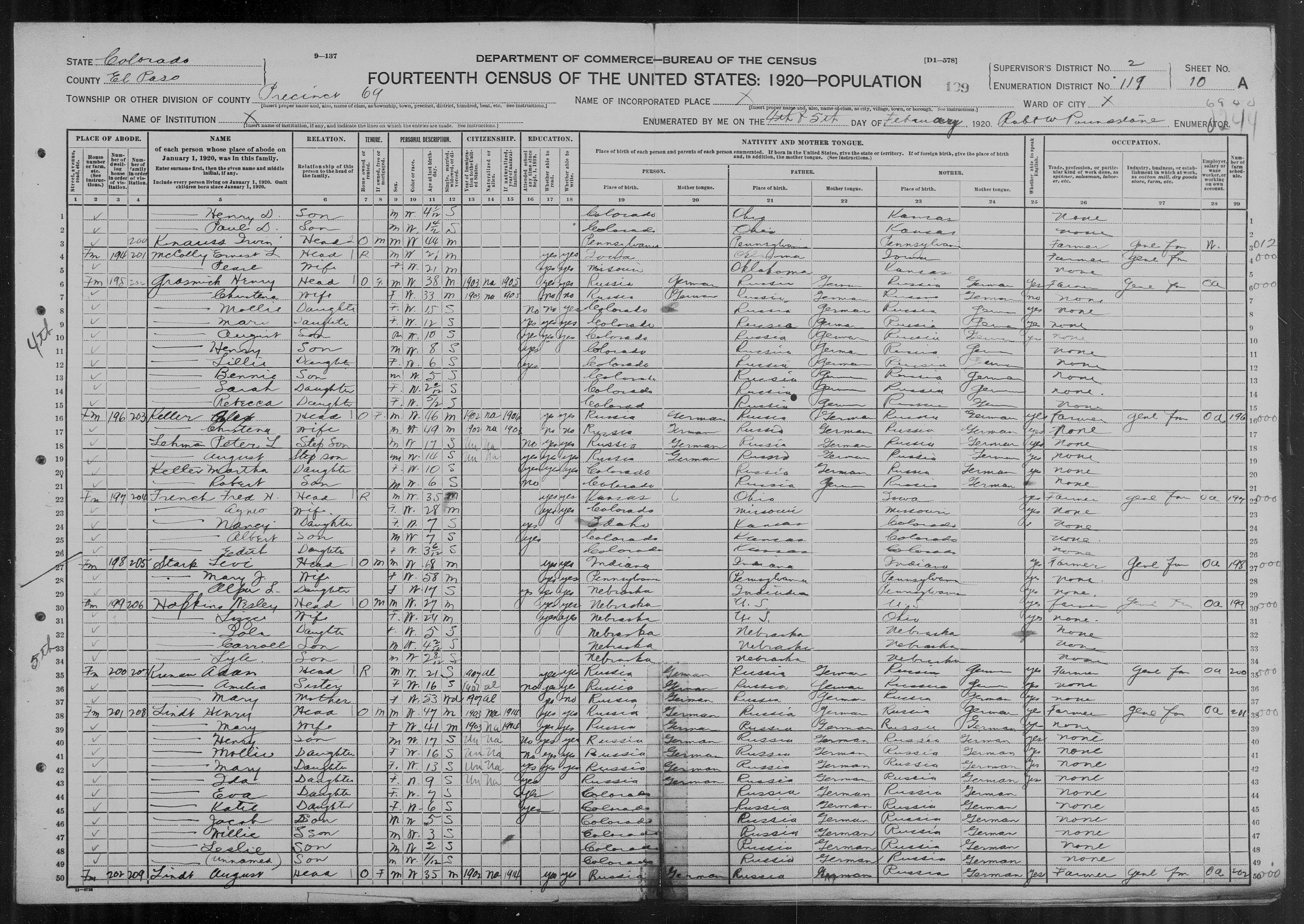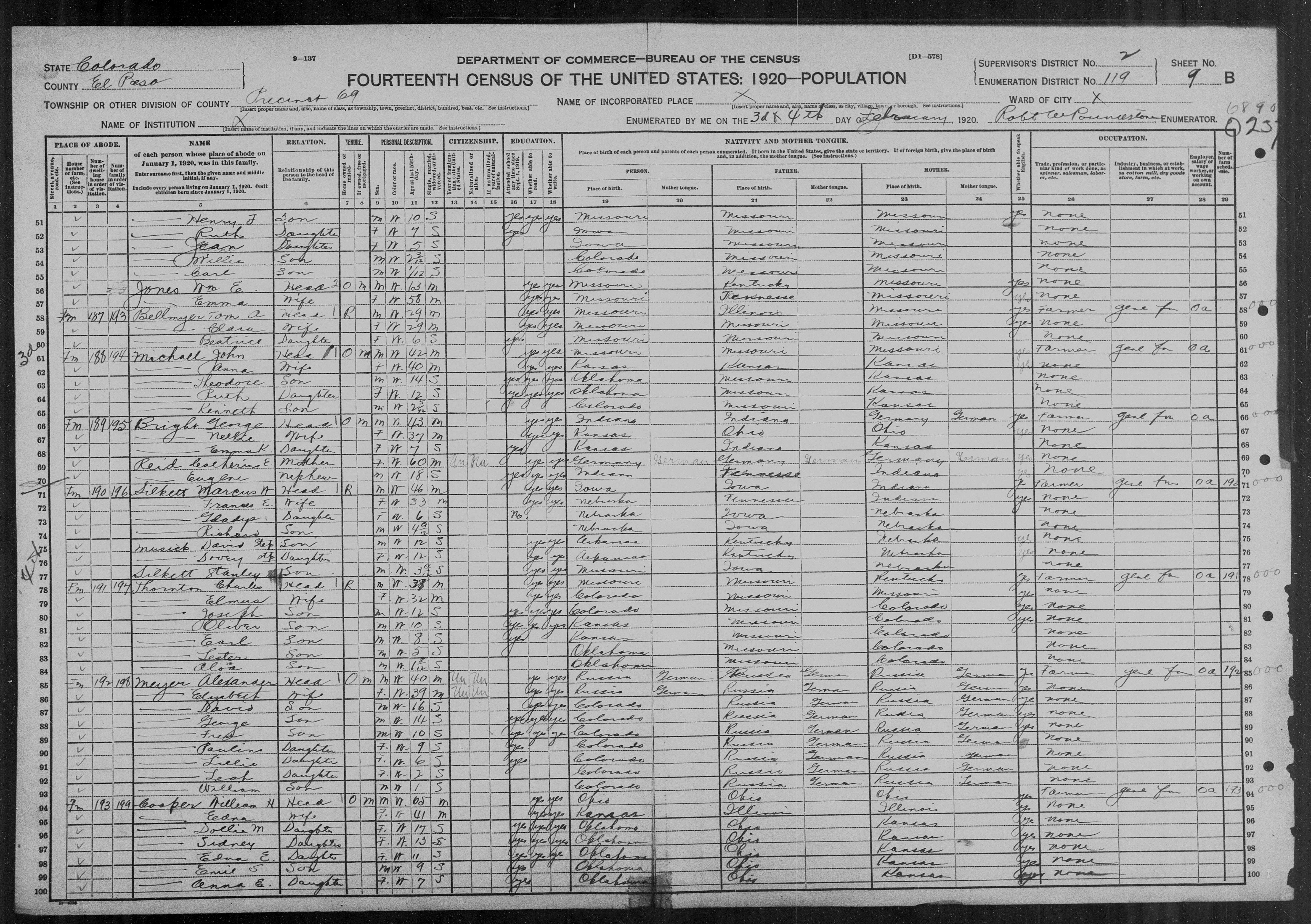 7016. “United States Census,” 1920, CO, El Paso, Precinct 69, 9B-10A, 2, 119, T625, 163, 982, Bureau of the Census, US Dept. of Commerce, United States of America, February 4, 1920, Robt W Pouncdstone.
