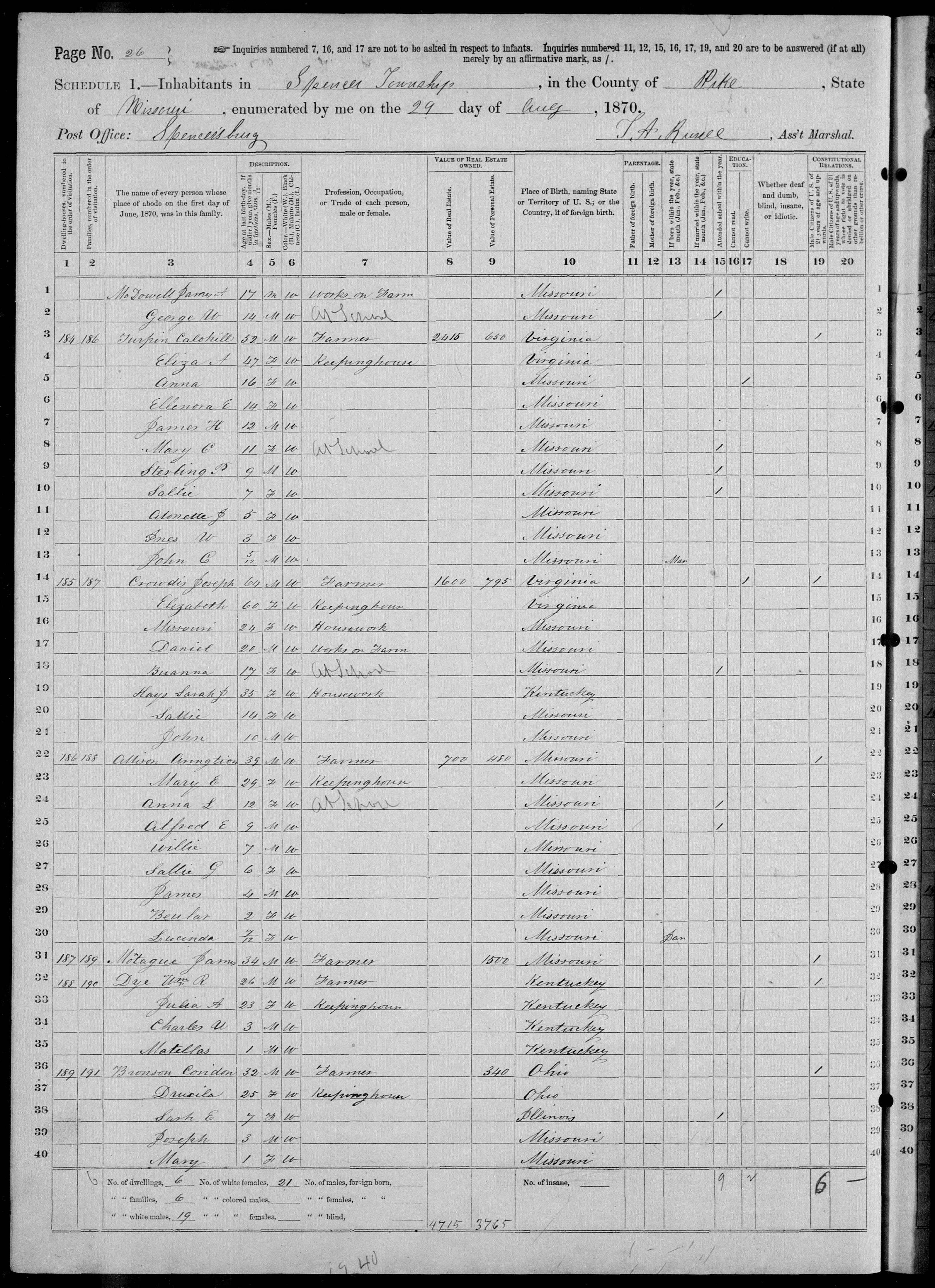 7018. “United States Census,” 1870, MO, Pike, Spencer, Spencersburg, 26, M593, Bureau of the Census, US Dept. of Commerce, United States of America, August 29, 1870, T A Russell.