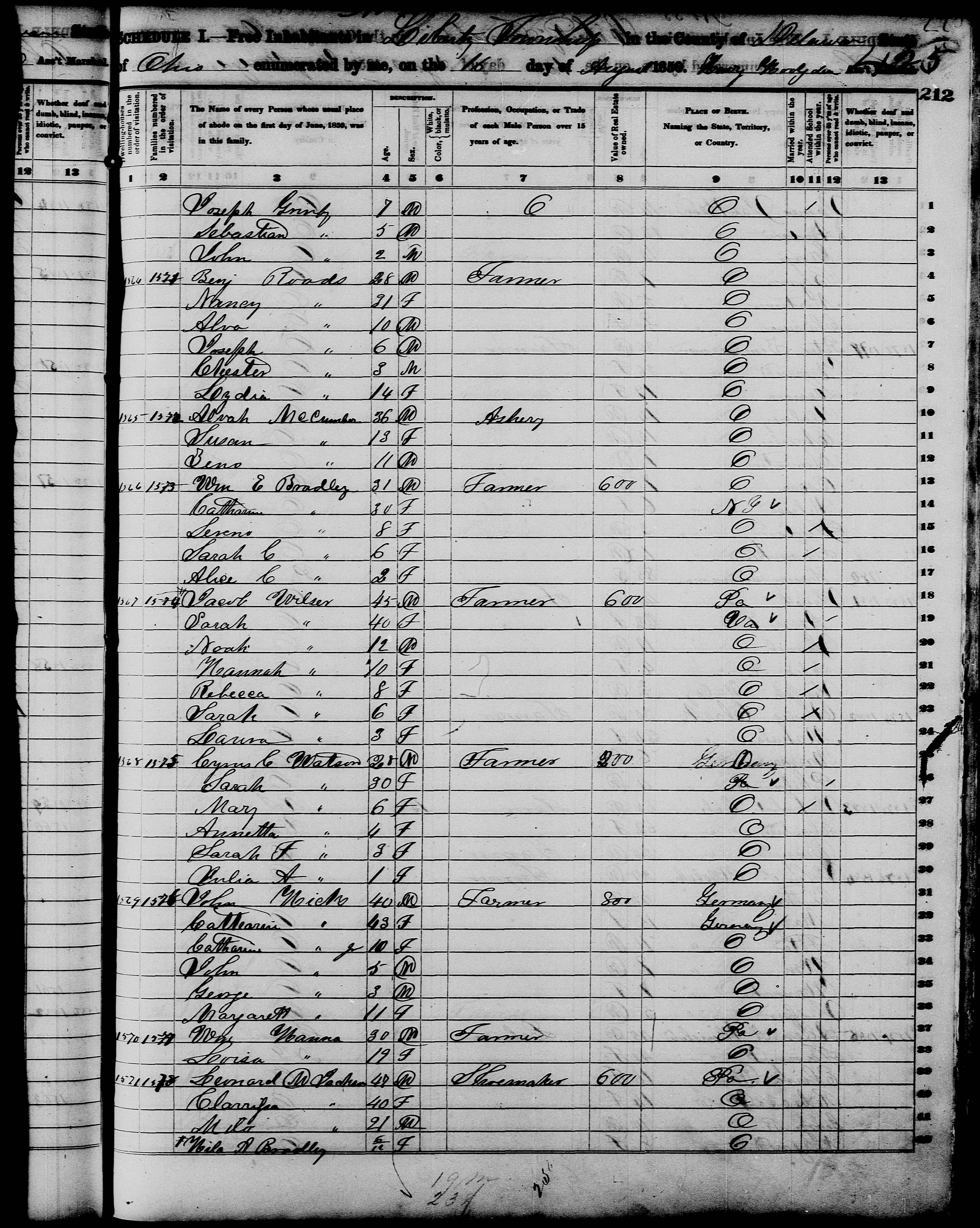 7027. “United States Census: 1850,” Bureau of the Census, US Dept. of Commerce, United States of America, 1850, OH, Delaware, Liberty, August 16, 1850, 425, M432, 675, 212, 17.