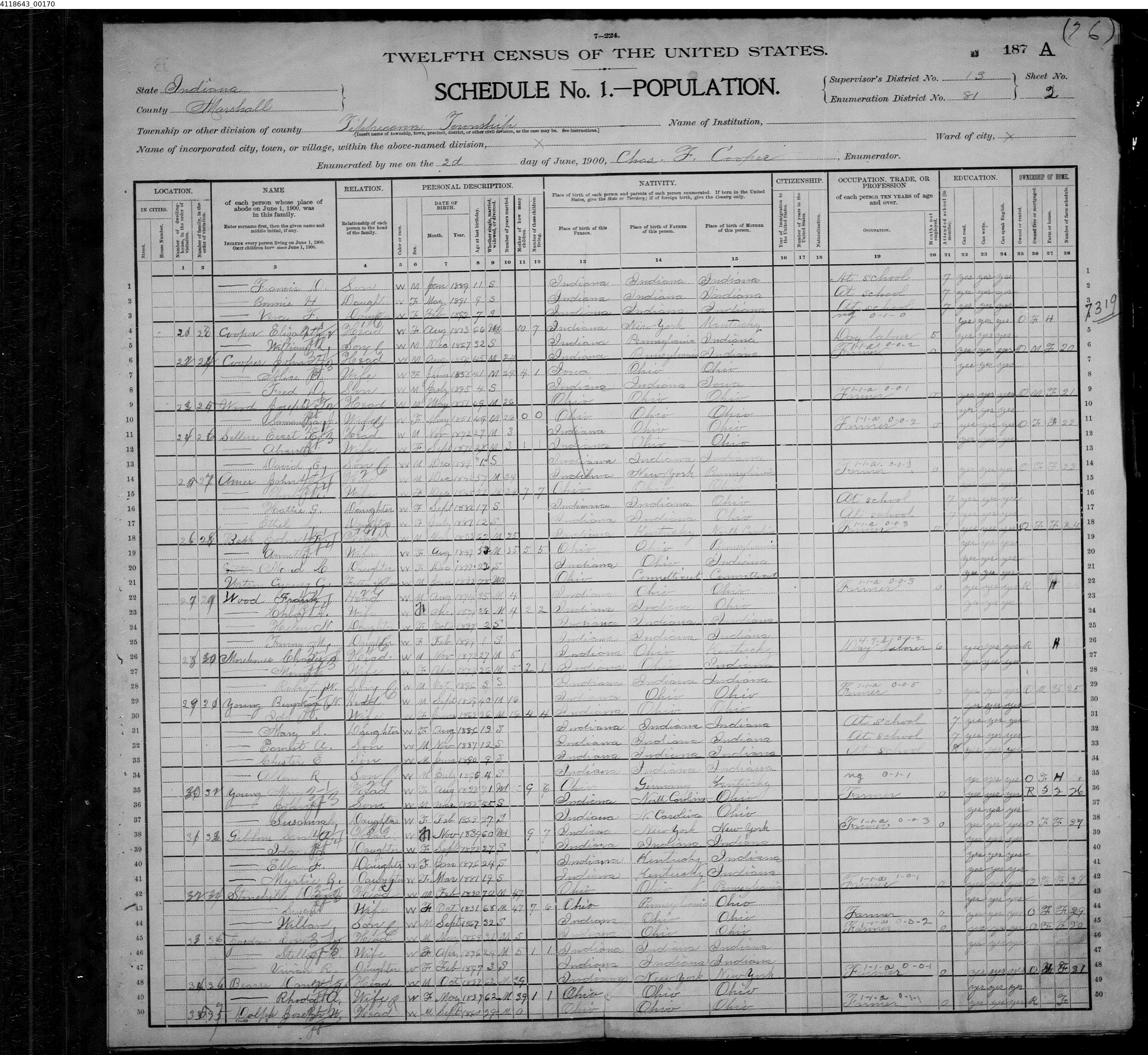 7028. “United States Census,” 1900, IN, Marshall, Tippecanoe, 2A, 13, 81, T623, Bureau of the Census, US Dept. of Commerce, United States of America, June 2, 1900, Chas. F Cooper.
