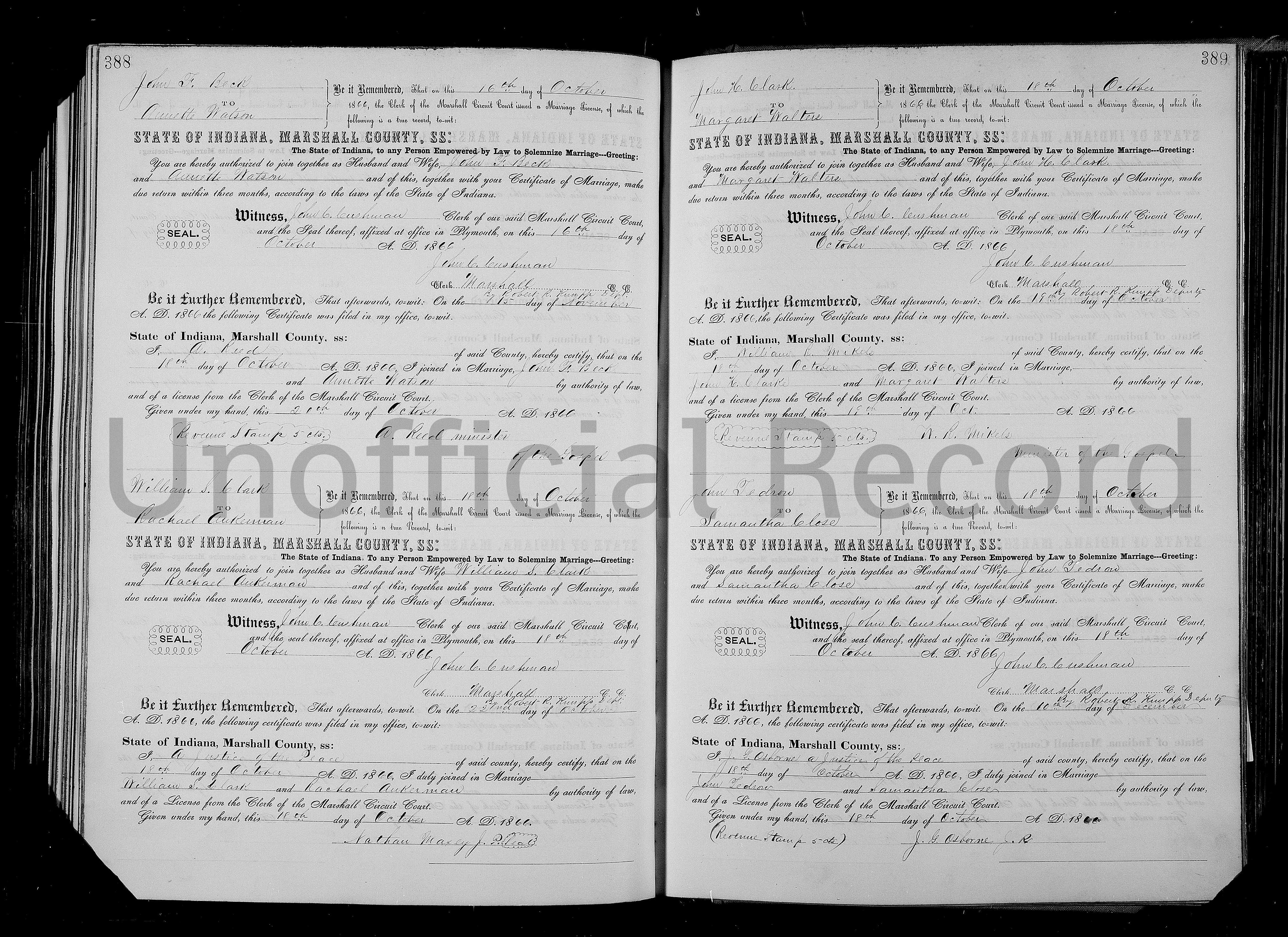 7031. John F Beck and Annette Watson, “Indiana Marriages, 1811-2007,” October 18, 1866, Marshall County, IN, https://www.familysearch.org/ark:/61903/1:1:XXGL-JL3.