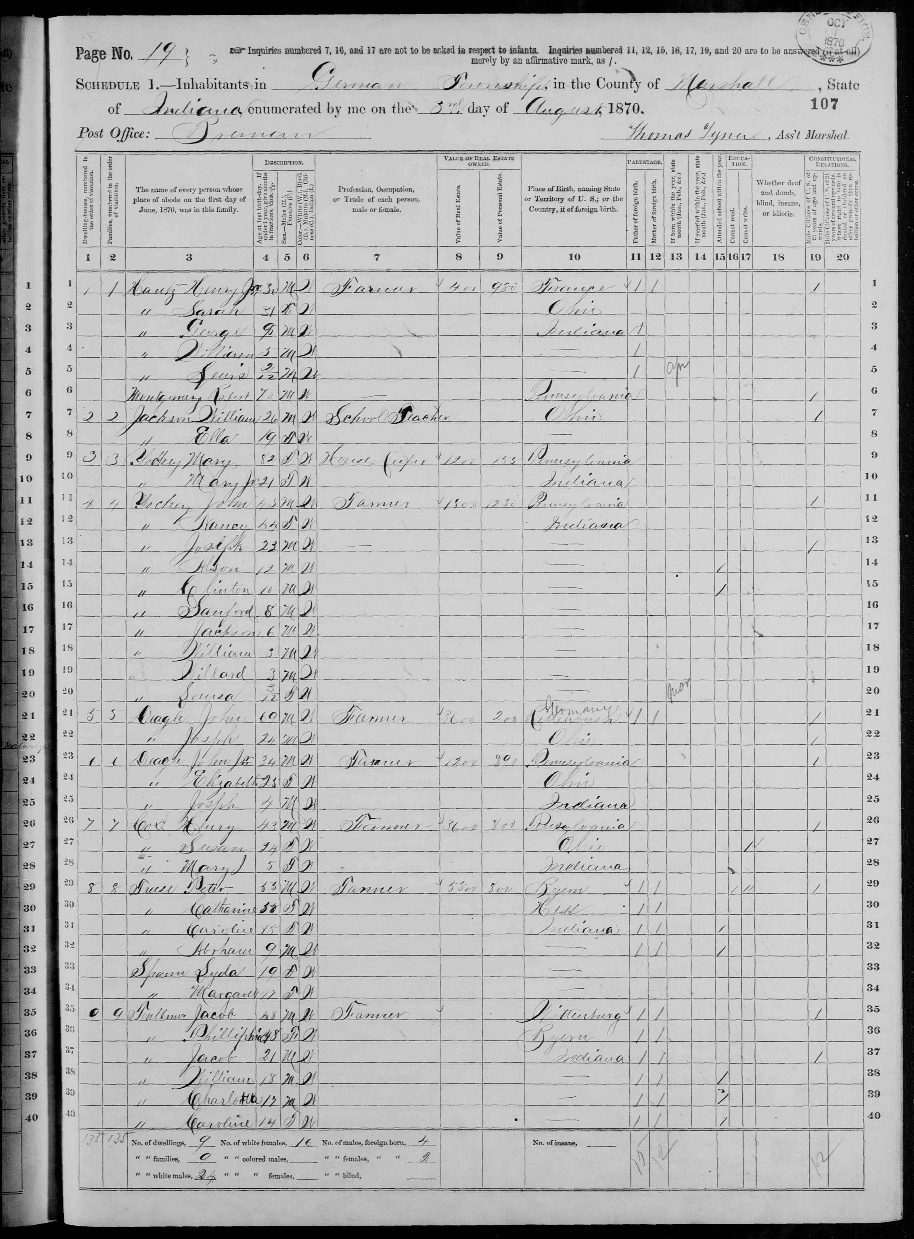 7036. “United States Census,” 1870, IN, Marshall, German, Bremen, 19, M593, Bureau of the Census, US Dept. of Commerce, United States of America, August 3, 1870, Thomas Tyner.