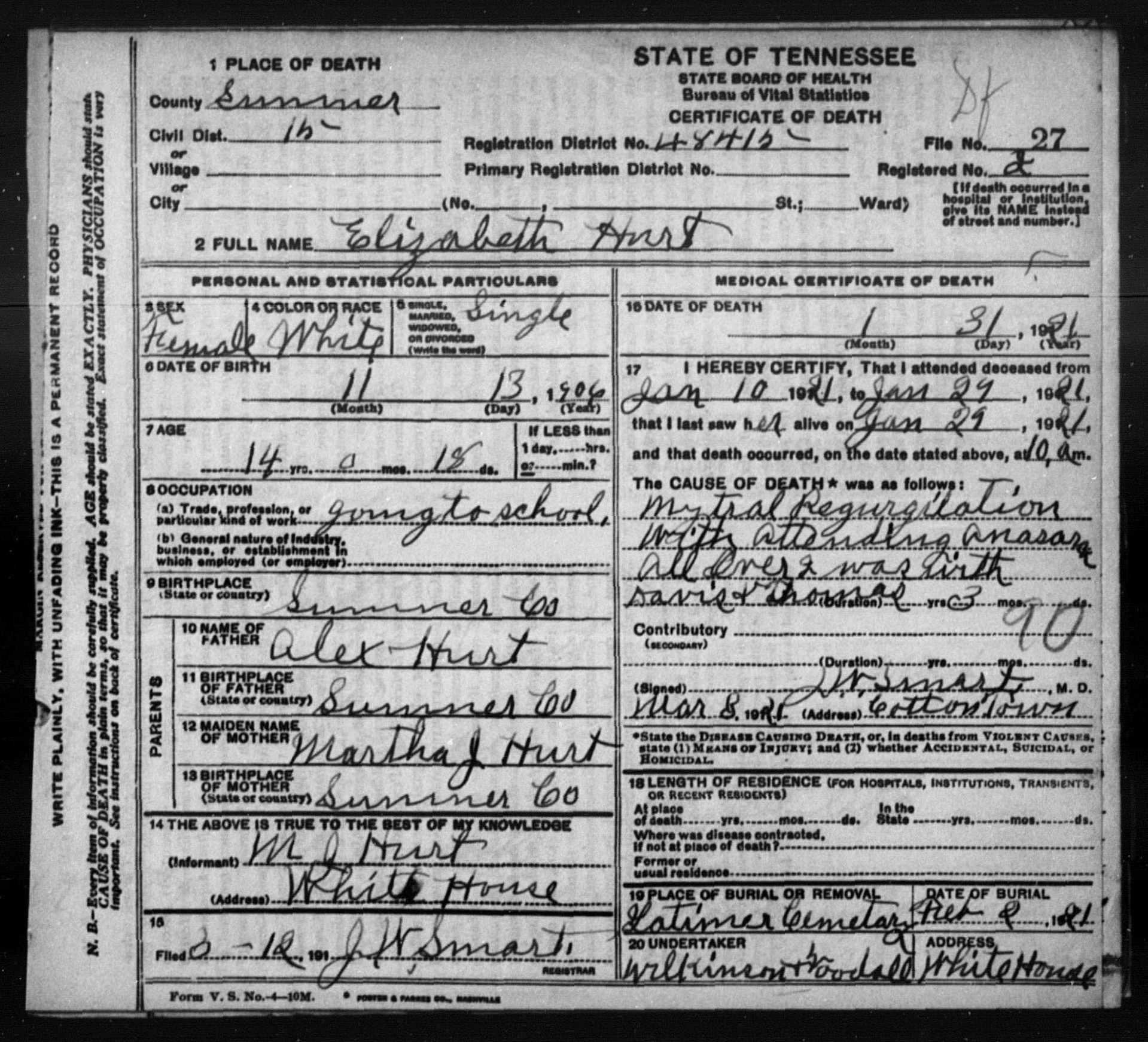 7050. Elizabeth Hurt, “Tennessee, Death Records, 1914-1955,” January 31, 1921, Sumner County, TN, microfilm, Digital Folder Number: 004184078-Image Number: 01073-GS Film number: 1299738-Reference ID: v 55 cn 27, https://familysearch.org/pal:/MM9.1.1/NSGY-TVF.