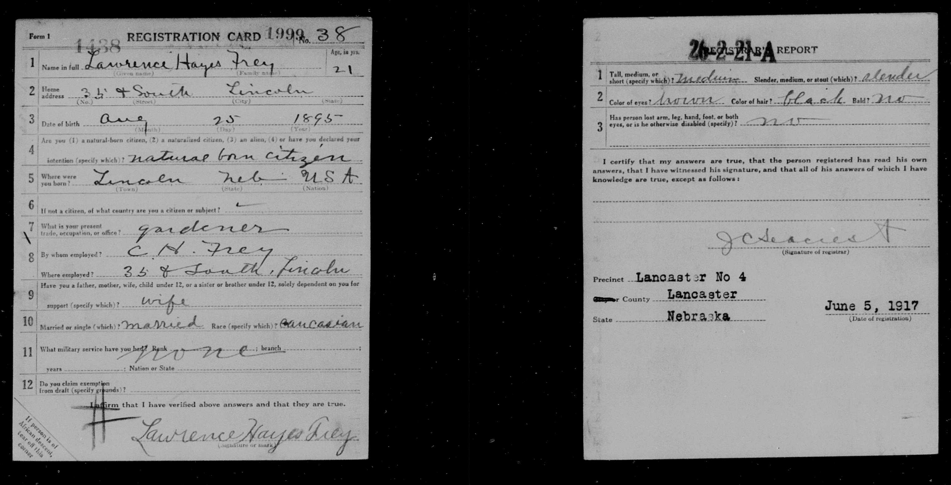 7781. World War I, 1917, Nebraska, 199938, Frey, Lawrence Hayes, “World War I Selective Service System Draft Registration Cards,” June 5, 1917, Lancaster, Lancaster County, NE, USA, Affiliate Publication Number: M1509 , GS Film Number: 1711701 , Digital Folder Number: 005253441 , Image Number: 01273, https://familysearch.org/ark:/61903/1:1:29JN-6WV.