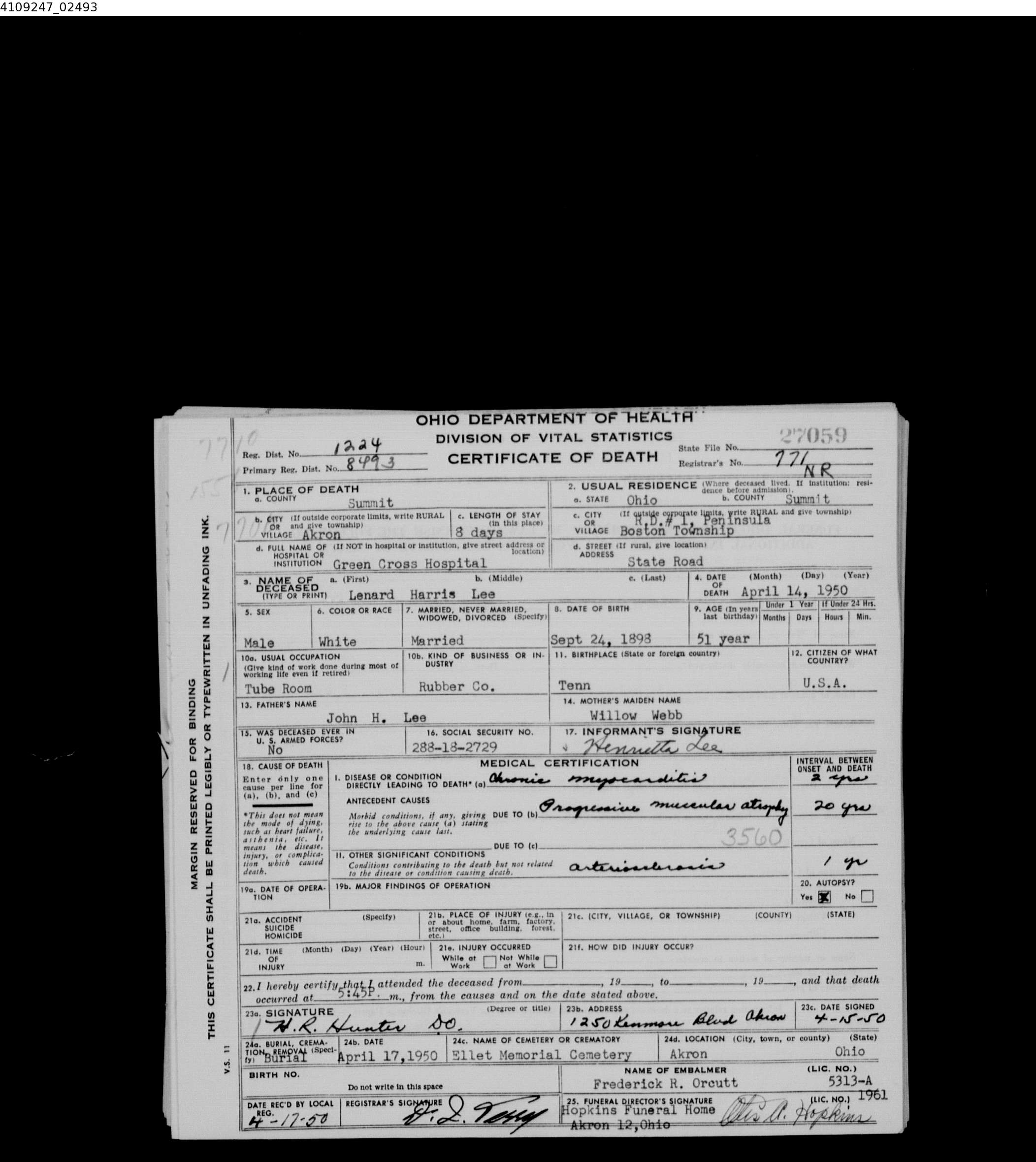 7793. Lenard Harris Lee, “Ohio, Deaths, 1908-1953,” April 14, 1950, Green Cross Hospital, Akron, Summit County, OH, File Number: Certificate , GS Film number: 2372592 , Digital Folder Number: 004109247 , Image Number: 02493, https://familysearch.org/pal:/MM9.1.1/X6FN-V4M.