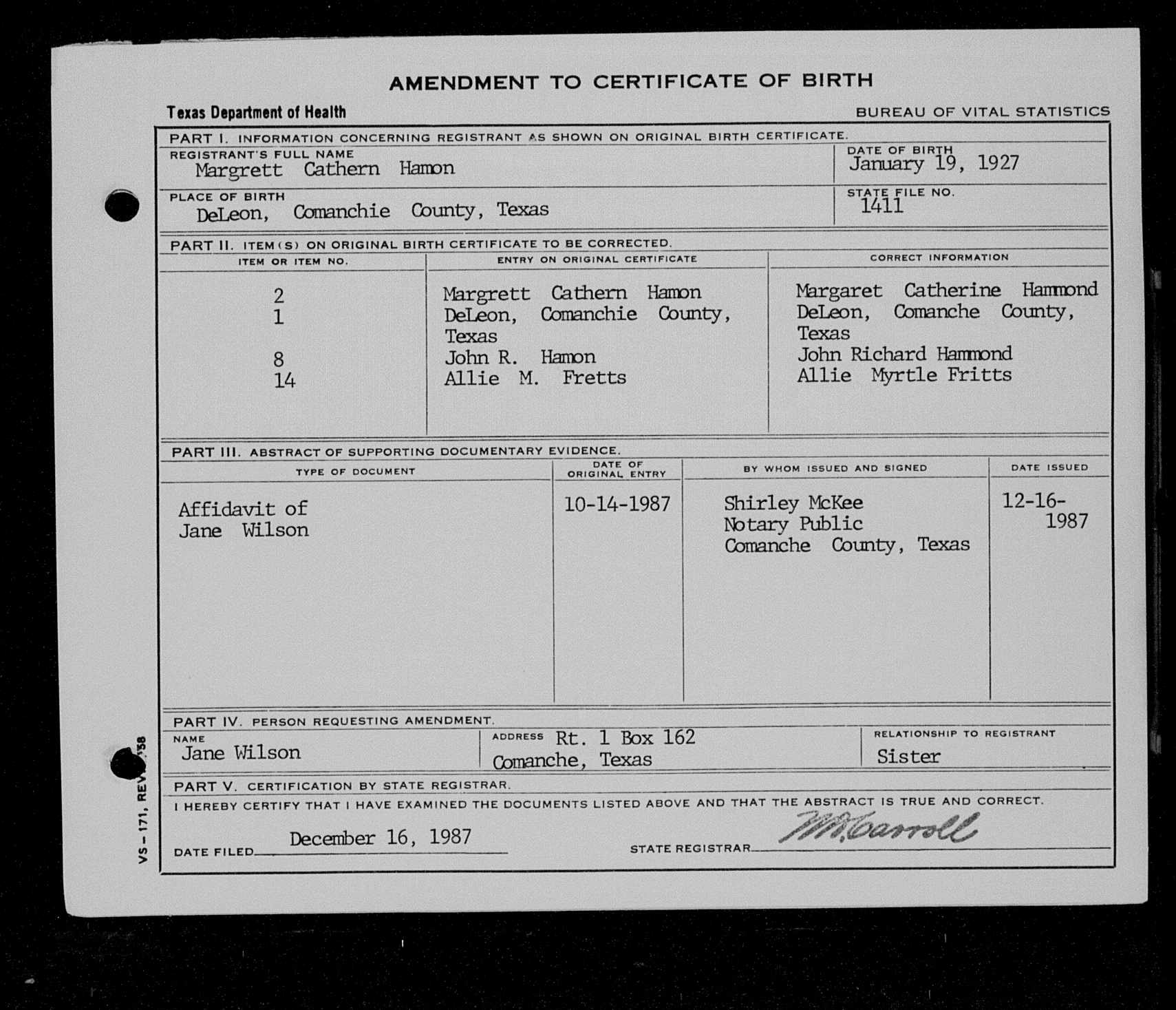 7882. Margaret Catherine Hammond, “Texas Birth Certificates, 1903-1935,” January 19, 1927, De Leon, Comanche County, TX, https://www.familysearch.org/ark:/61903/1:1:VHZR-TX4.