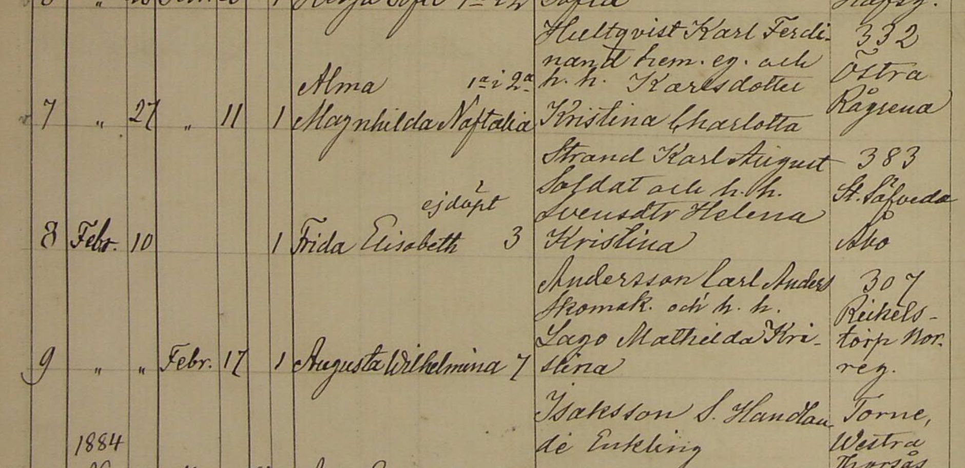 7883. Alma Magnhilda Naftalia Hultqvist, “Sweden Baptisms, 1611-1920,” February 11, 1885, Bringetofta, Jönköping, Sweden, Image 52, https://familysearch.org/ark:/61903/1:1:F27T-JHT.
