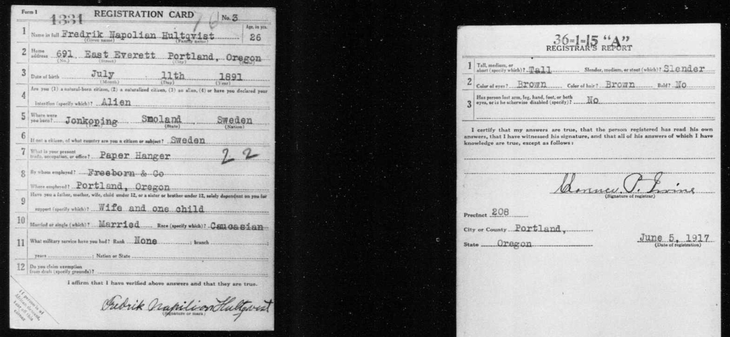 7886. World War I, 1917, Oregon, 1331, Hultqvist, Fredrik Napolian, “World War I Selective Service System Draft Registration Cards,” June 5, 1917, Portland, OR, https://familysearch.org/ark:/61903/1:1:K6ZY-ZJY.