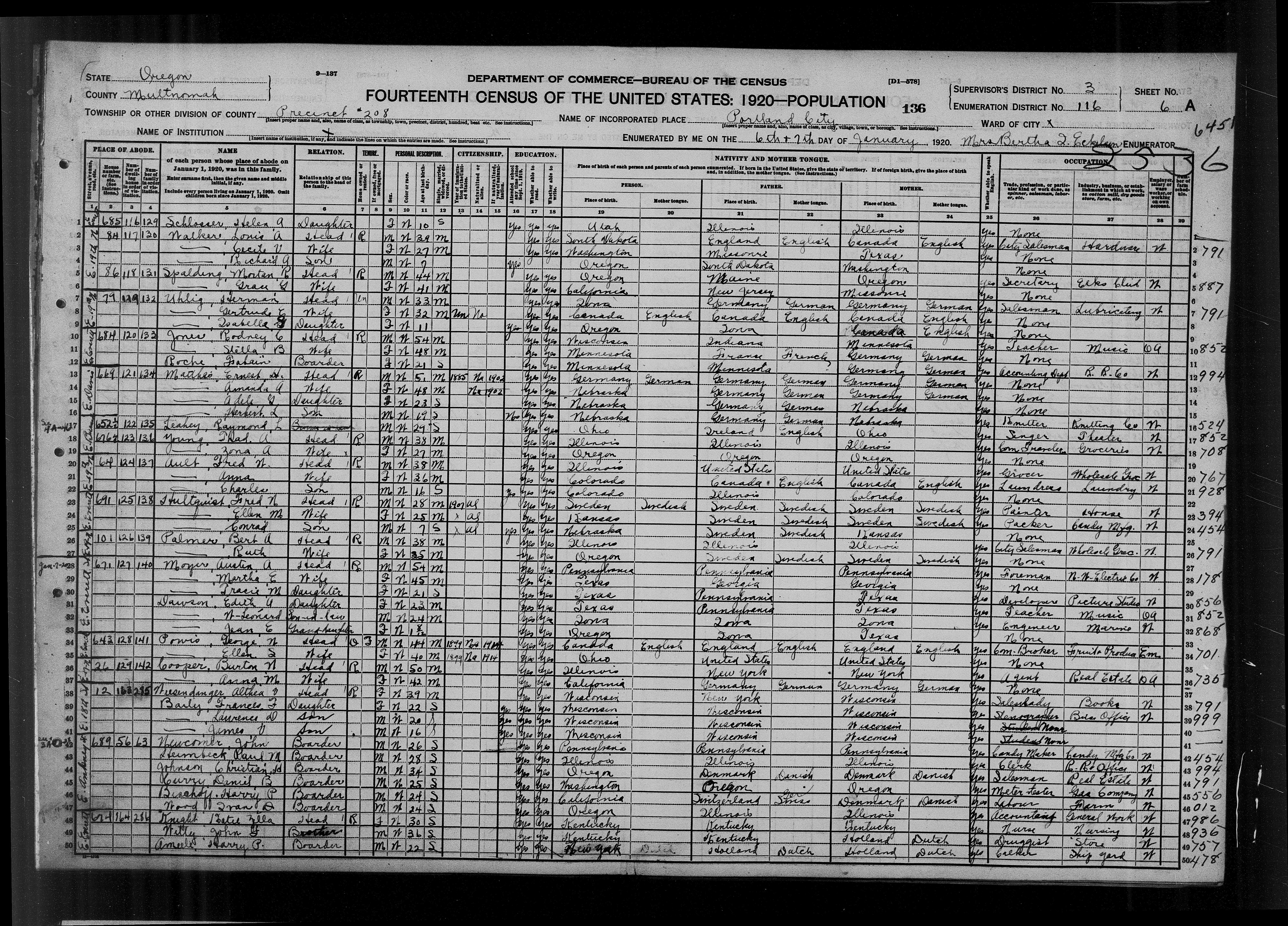 7888. “United States Census,” 1920, OR, Multnomah, Portland, Precinct 208, 6A, 3, 116, T625, 1821501, 826, January 6, 1920, Mrs. Bertha Q Ecklan, https://familysearch.org/ark:/61903/1:1:M48N-77D.