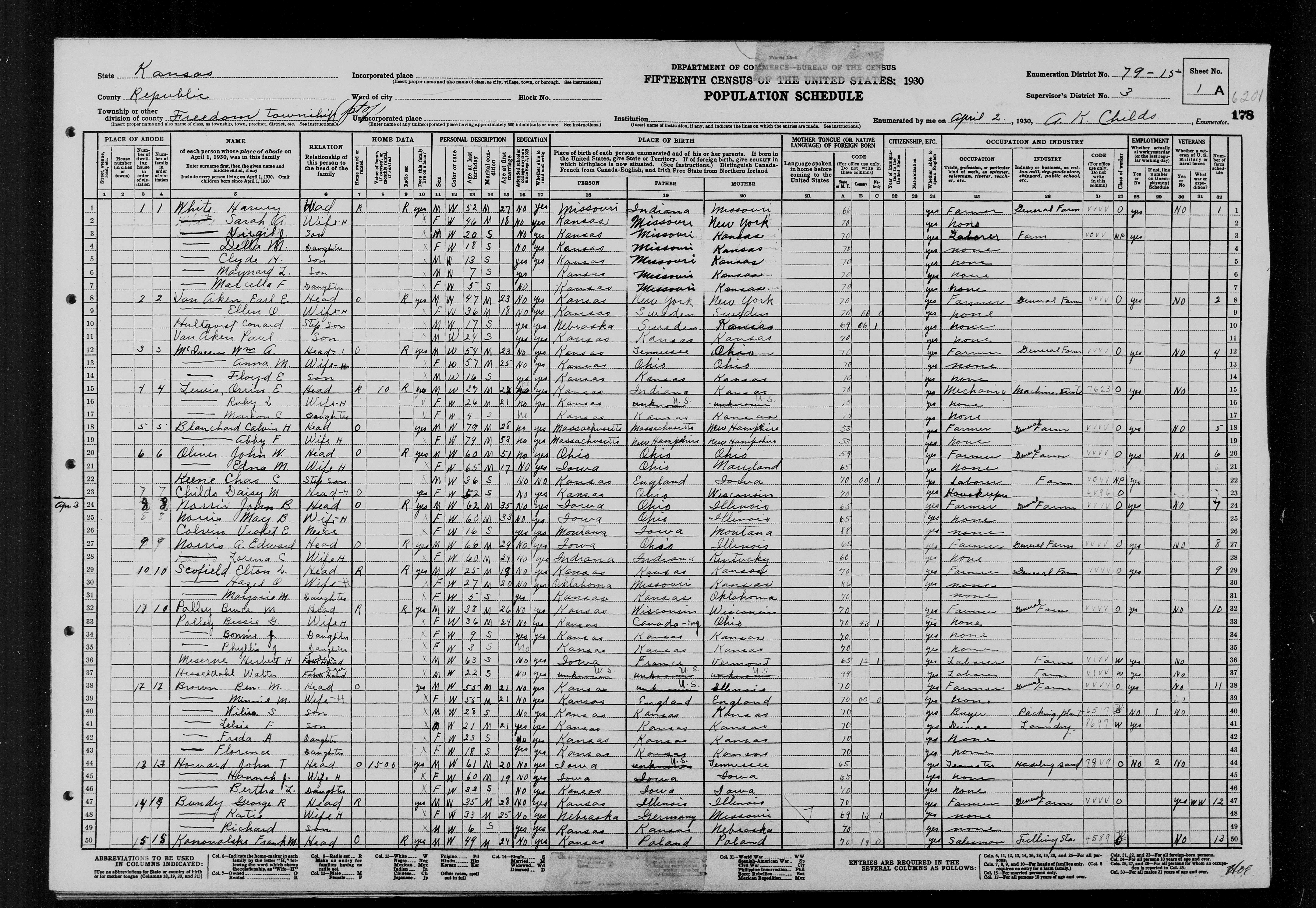 7894. “United States Census,” 1930, KS, Republic, Fredom, 1A, 3, 79-15, T626, 716, 361, Bureau of the Census, US Dept. of Commerce, United States of America, April 2, 1930, A K Childs.