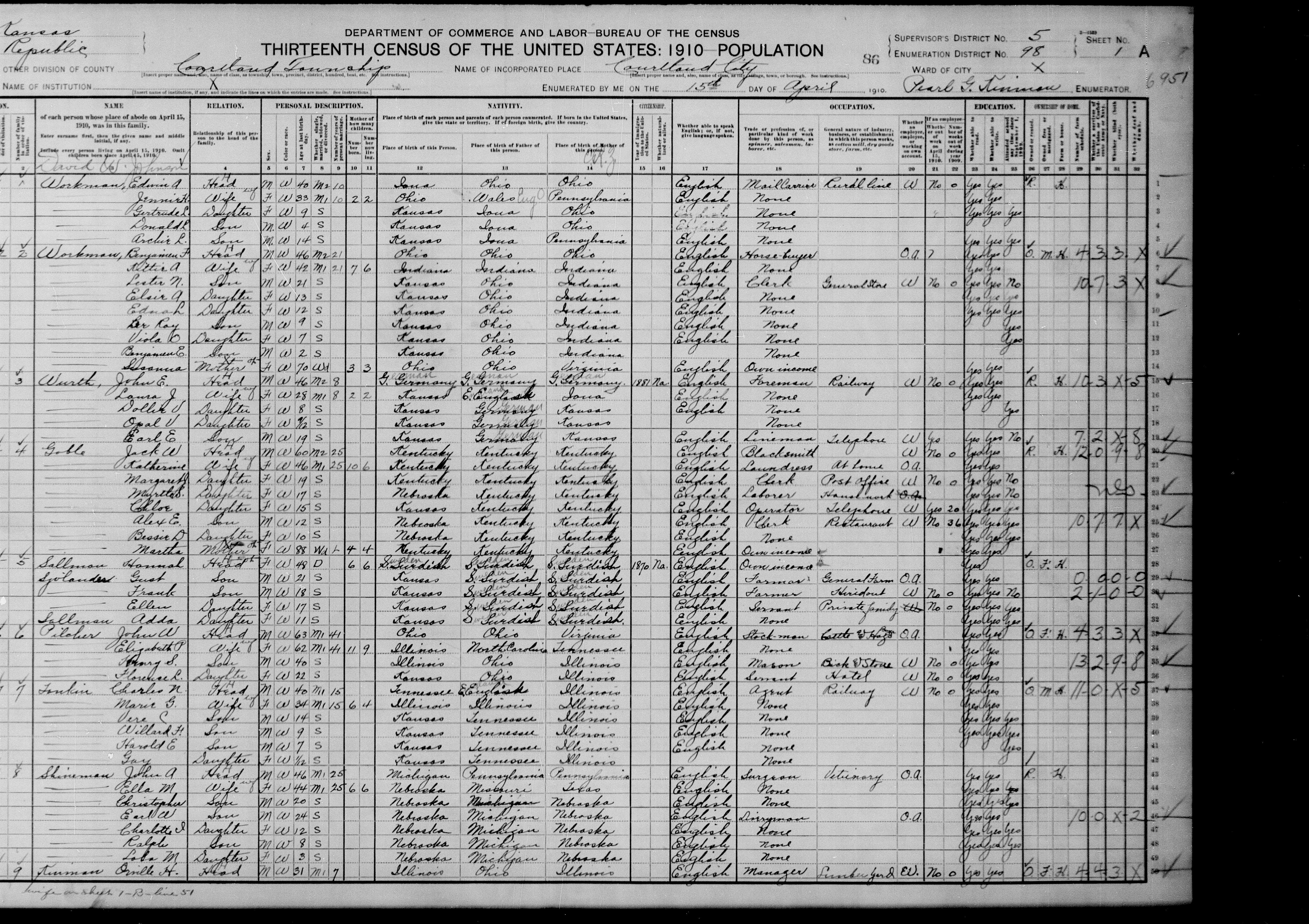 7903. “United States Census,” 1910, KS, Republic, Courtland, District 09, 1A, 5, 98, T624, 176, Bureau of the Census, US Dept. of Commerce, United States of America, April 15, 1910, Pearl G Kinison.