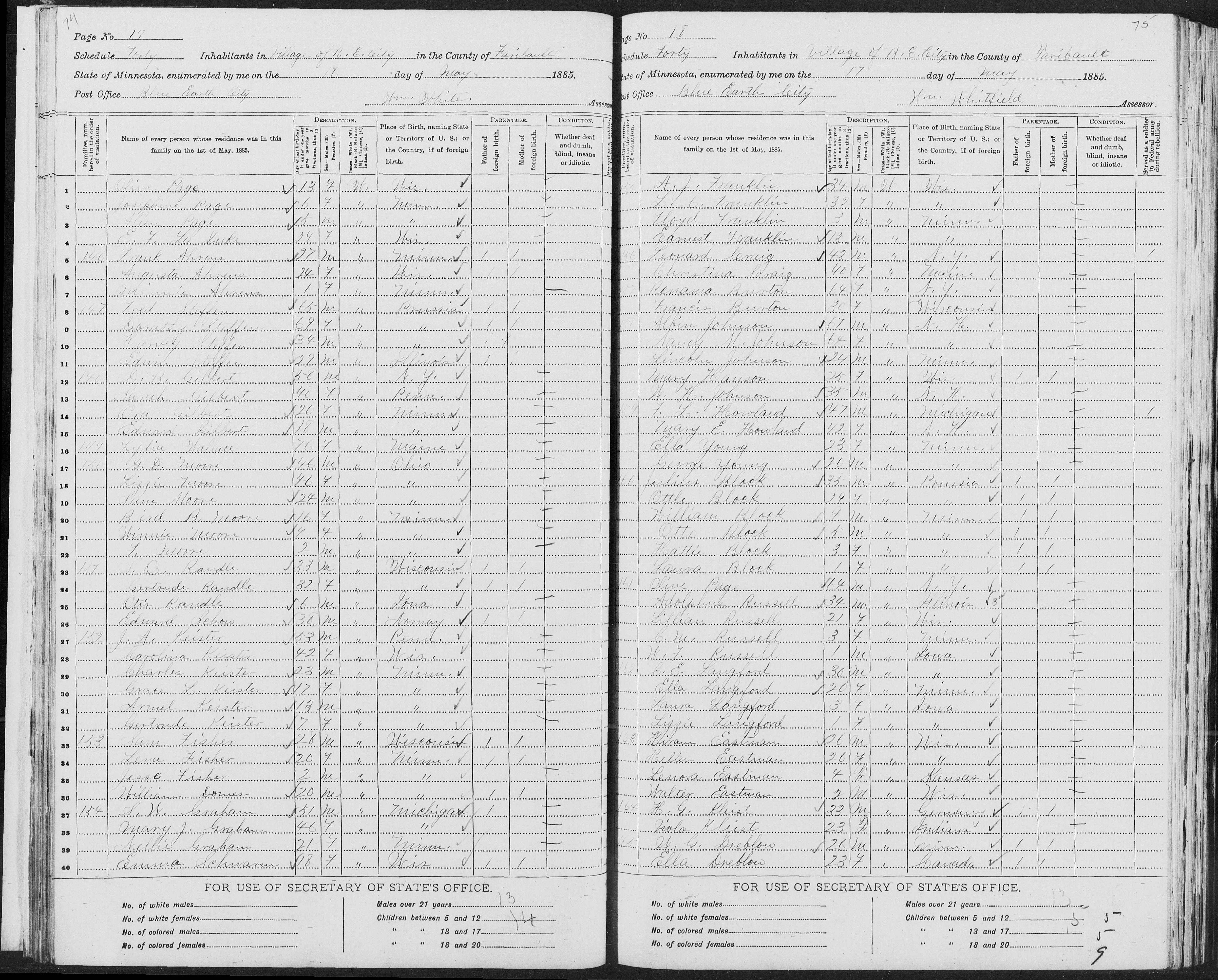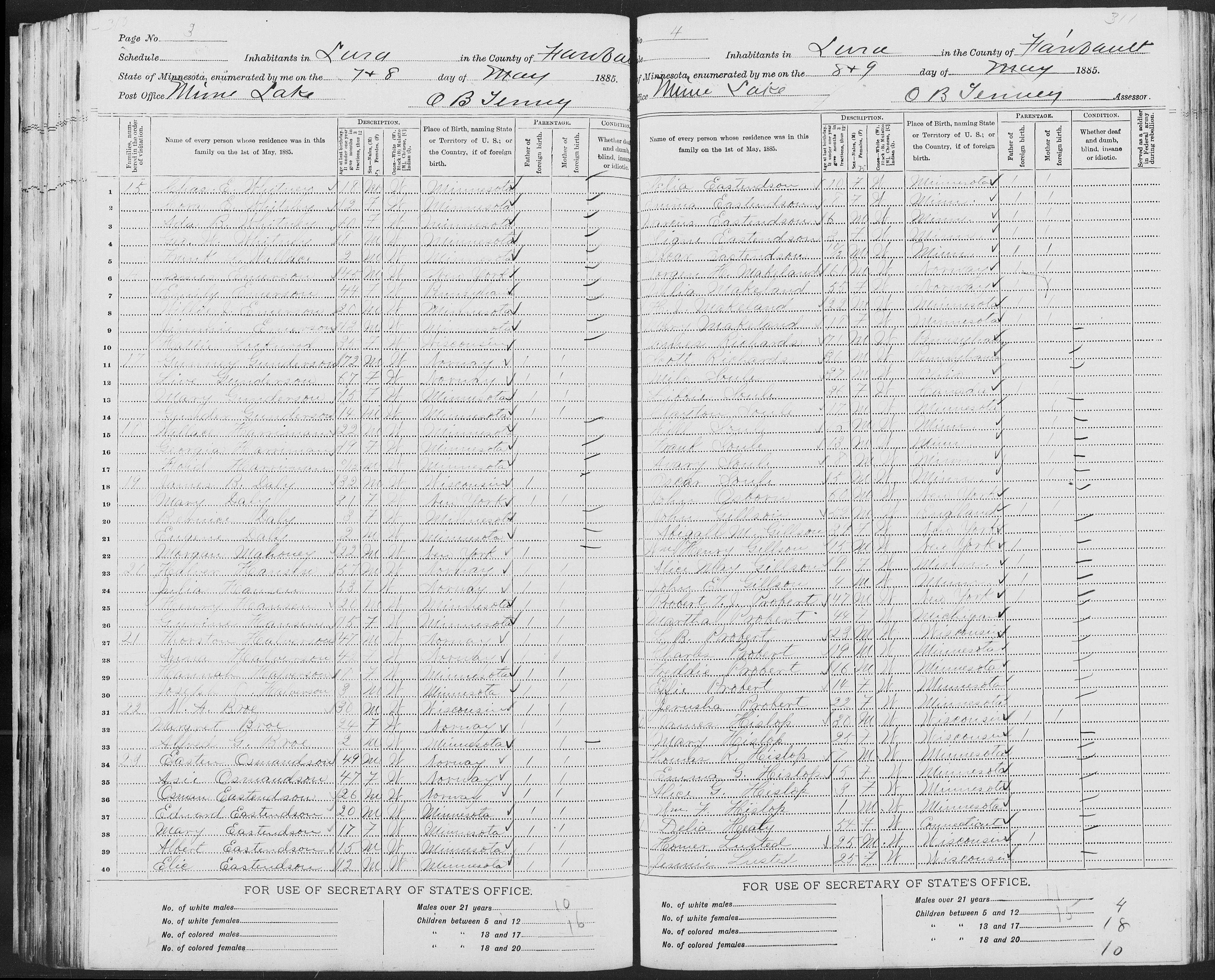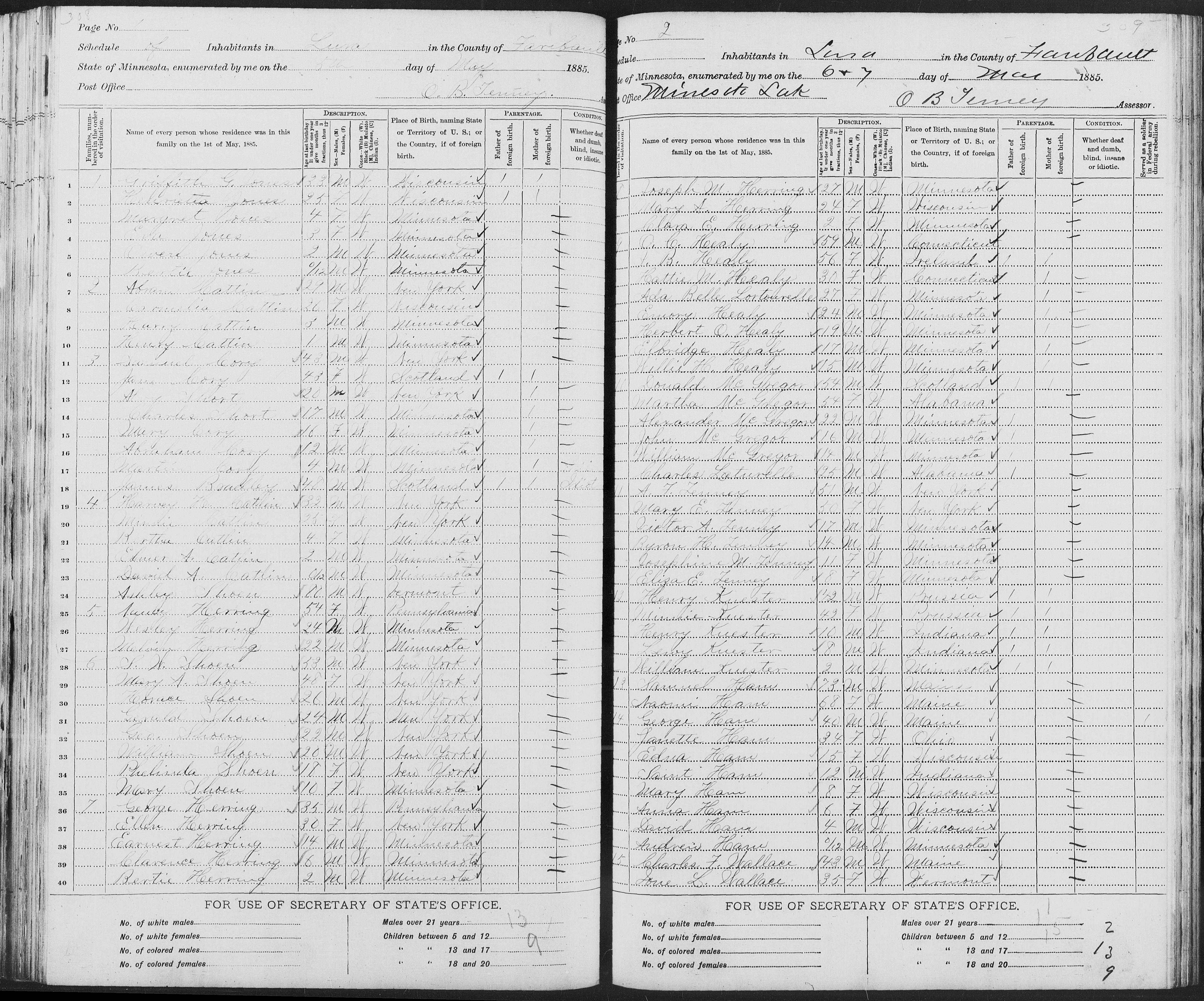 7916. “Minnesota State Census,” 1885, MN, Faribault, Lura, Mime Lake, 2-3, 565738, May 7, 1885, O B Tenney.