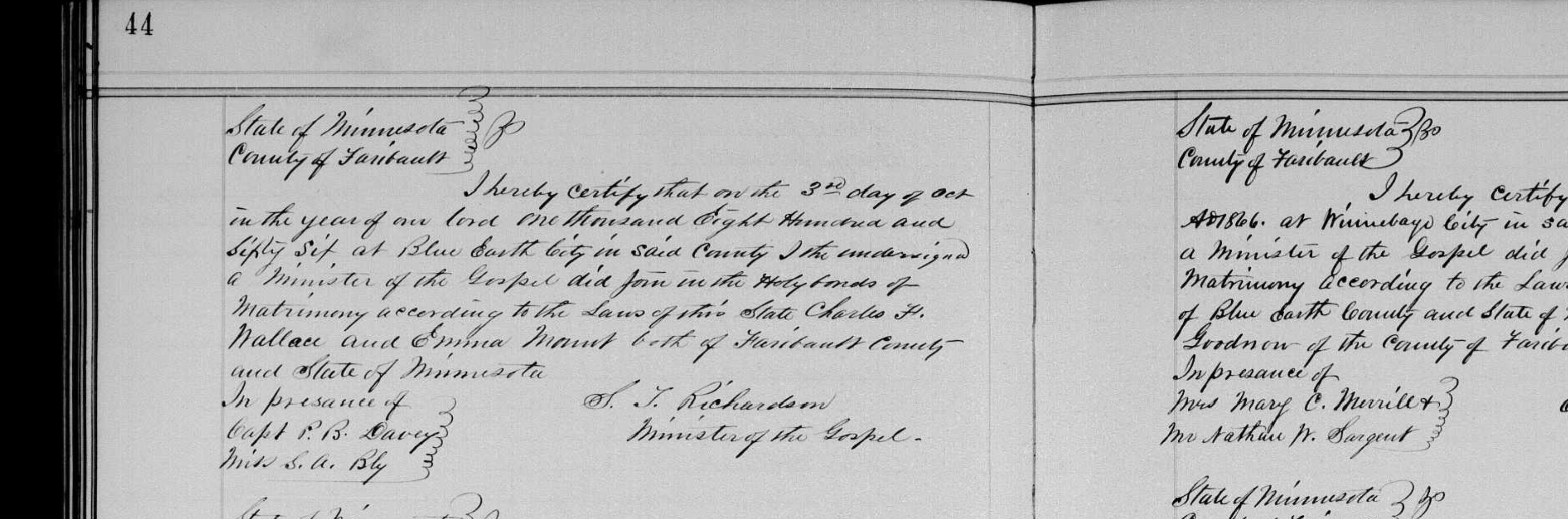 7921. Charles F Wallace and Emma Mount, “Minnesota Marriages, 1849-1950,” October 3, 1866, Blue Earth, Faribault County, MN, Indexing Project (Batch) Number M01674-0-System Origin Minnesota-EASy-GS Film number 1673580-Reference ID 44, https://familysearch.org/ark:/61903/1:1:FDZ1-NJX.