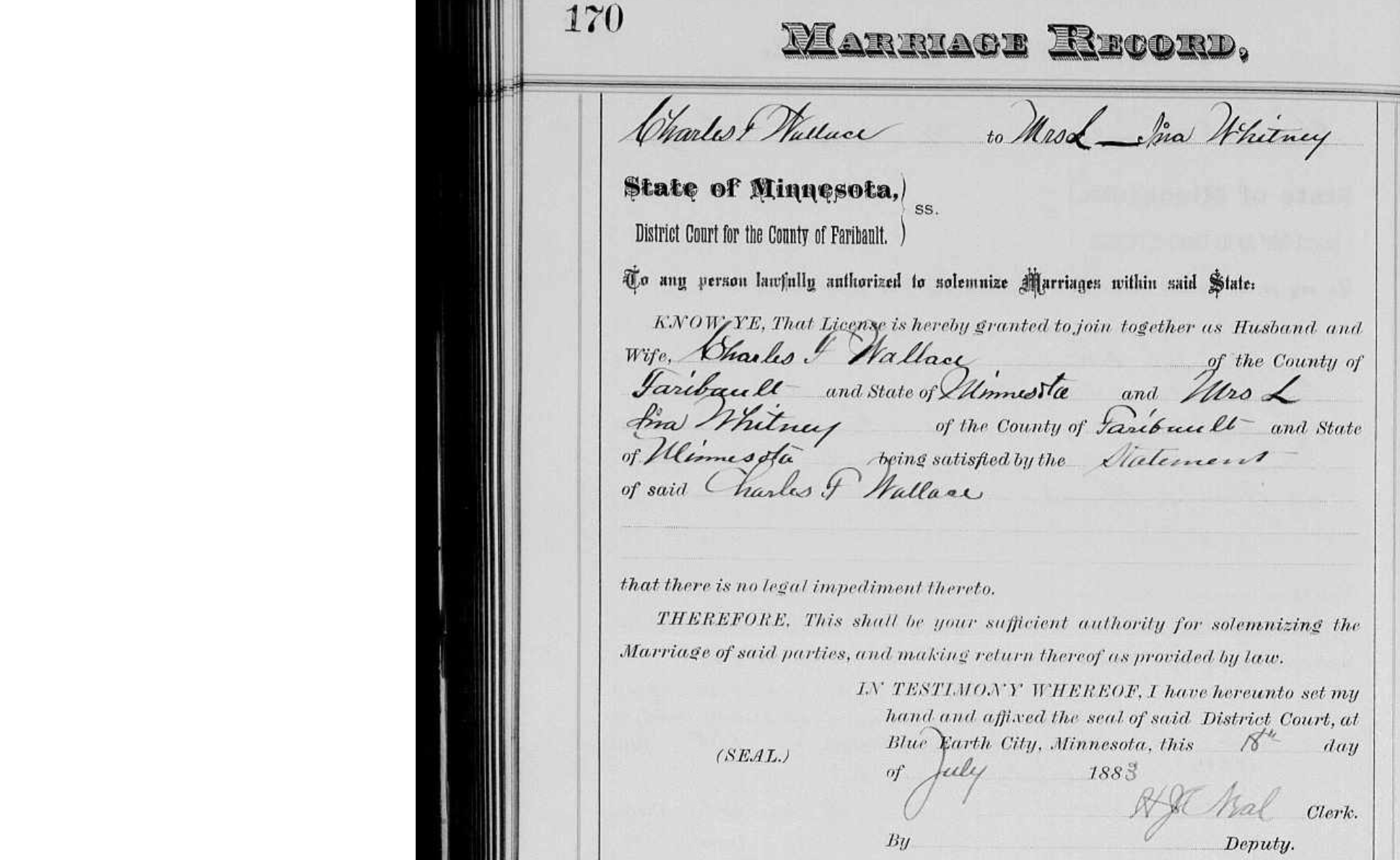 7923. Charles F Wallace and L Ina Whitney, “Minnesota Marriages, 1849-1950,” July 18 1883, Faribault County, MN, Indexing Project (Batch) Number M73421-3-System Origin Minnesota-EASy-GS Film number 1673581-Reference ID p170, https://familysearch.org/ark:/61903/1:1:FD6K-6M5.