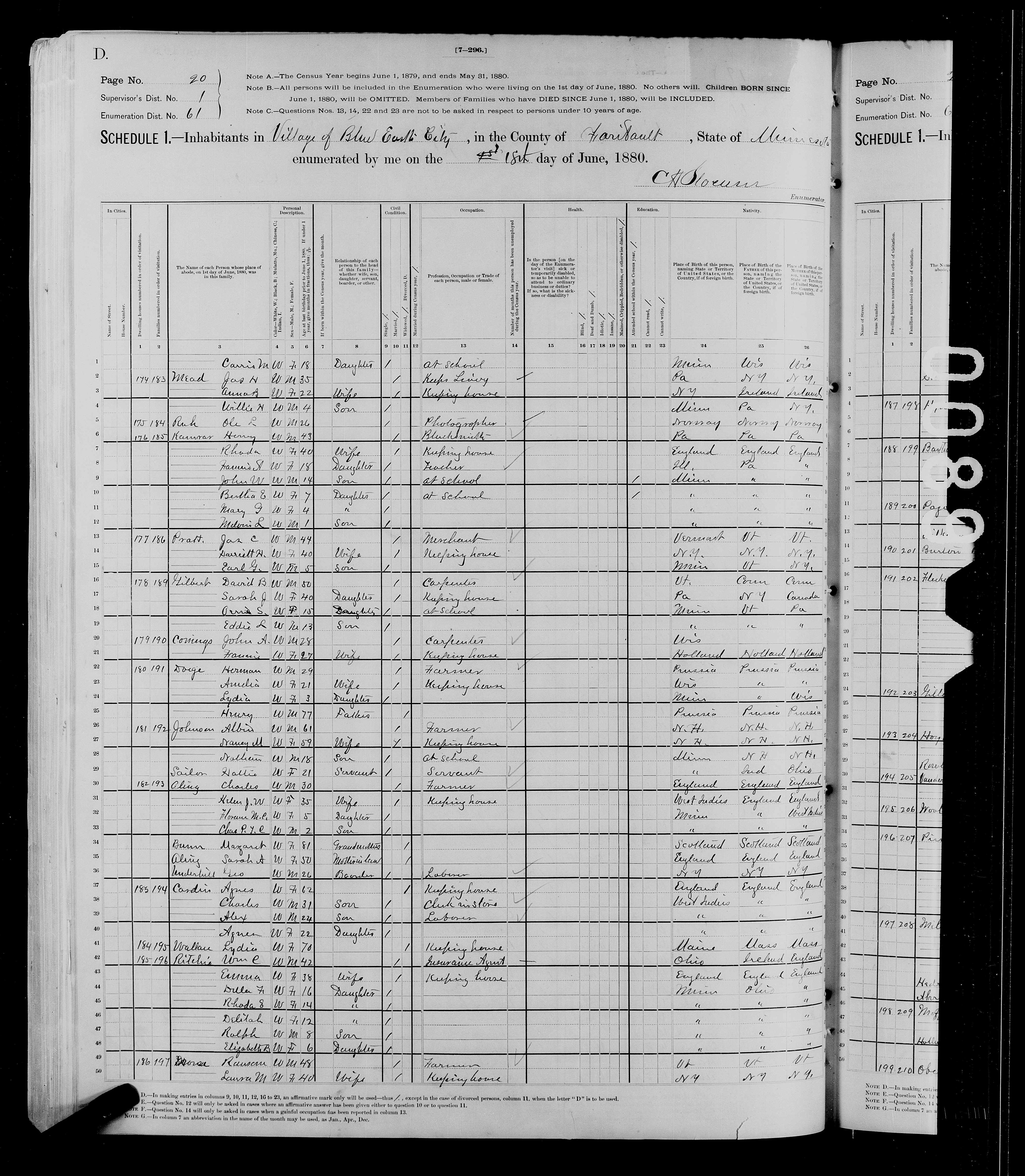 7941. “United States Census,” 1870, MN, Faribault County, Blue Earth, 8, M593, 402, Bureau of the Census, US Dept. of Commerce, United States of America, June 29, 1870, S P Cluld.