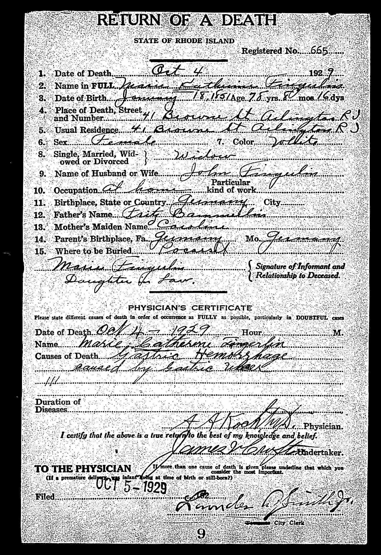 7968. Marie Katherine Fingerlin, “Rhode Island Deaths and Burials, 1802-1950,” October 4, 1929, Cranston, RI, https://www.familysearch.org/ark:/61903/1:1:F8HH-ZH5.