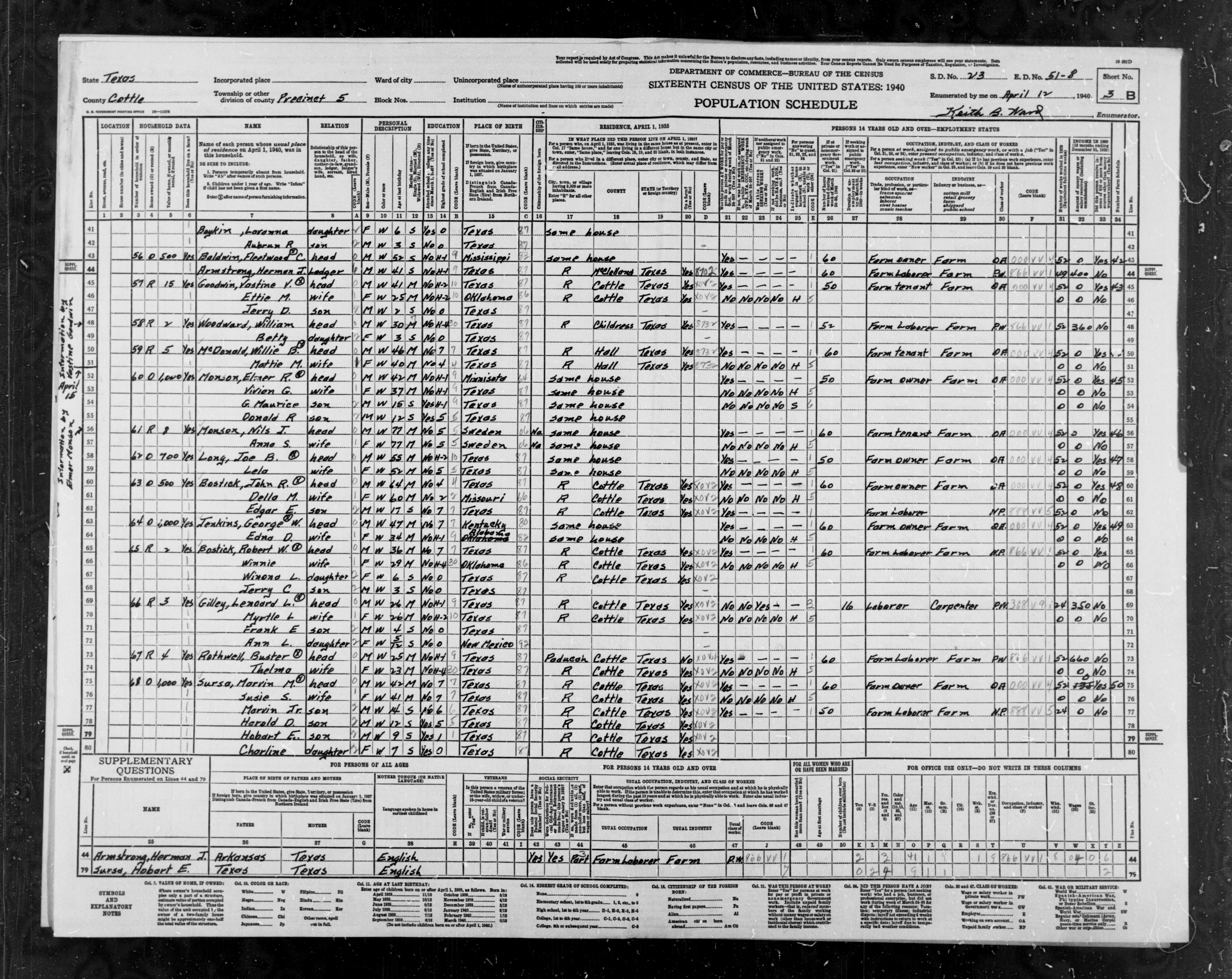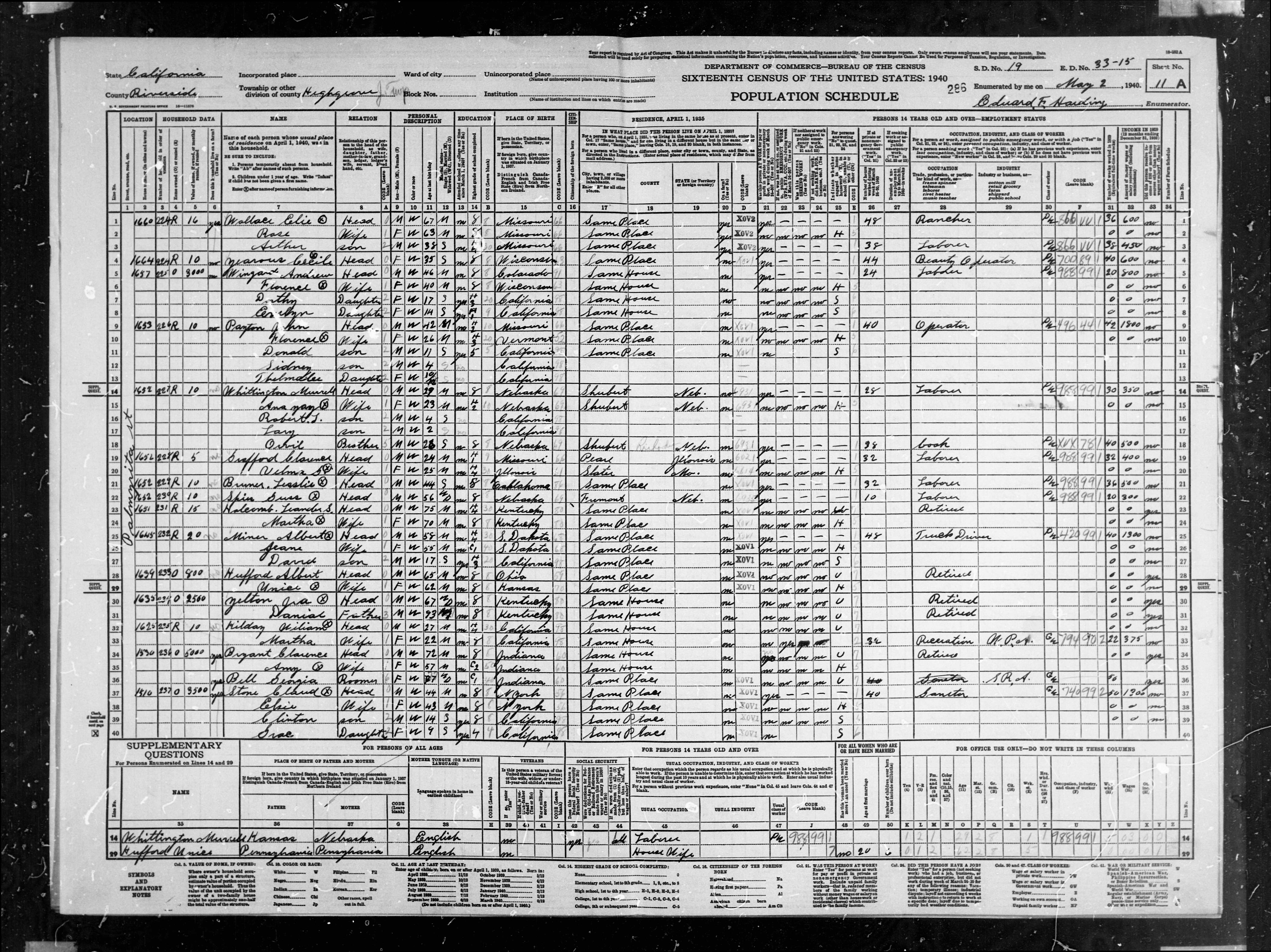 8001. “United States Census,” 1940, CA, Riverside, Highgrove, 11A, 19, 33-15, T627, 276, 926, Bureau of the Census, US Dept. of Commerce, United States of America, May 2, 1940, Edward F Harding.