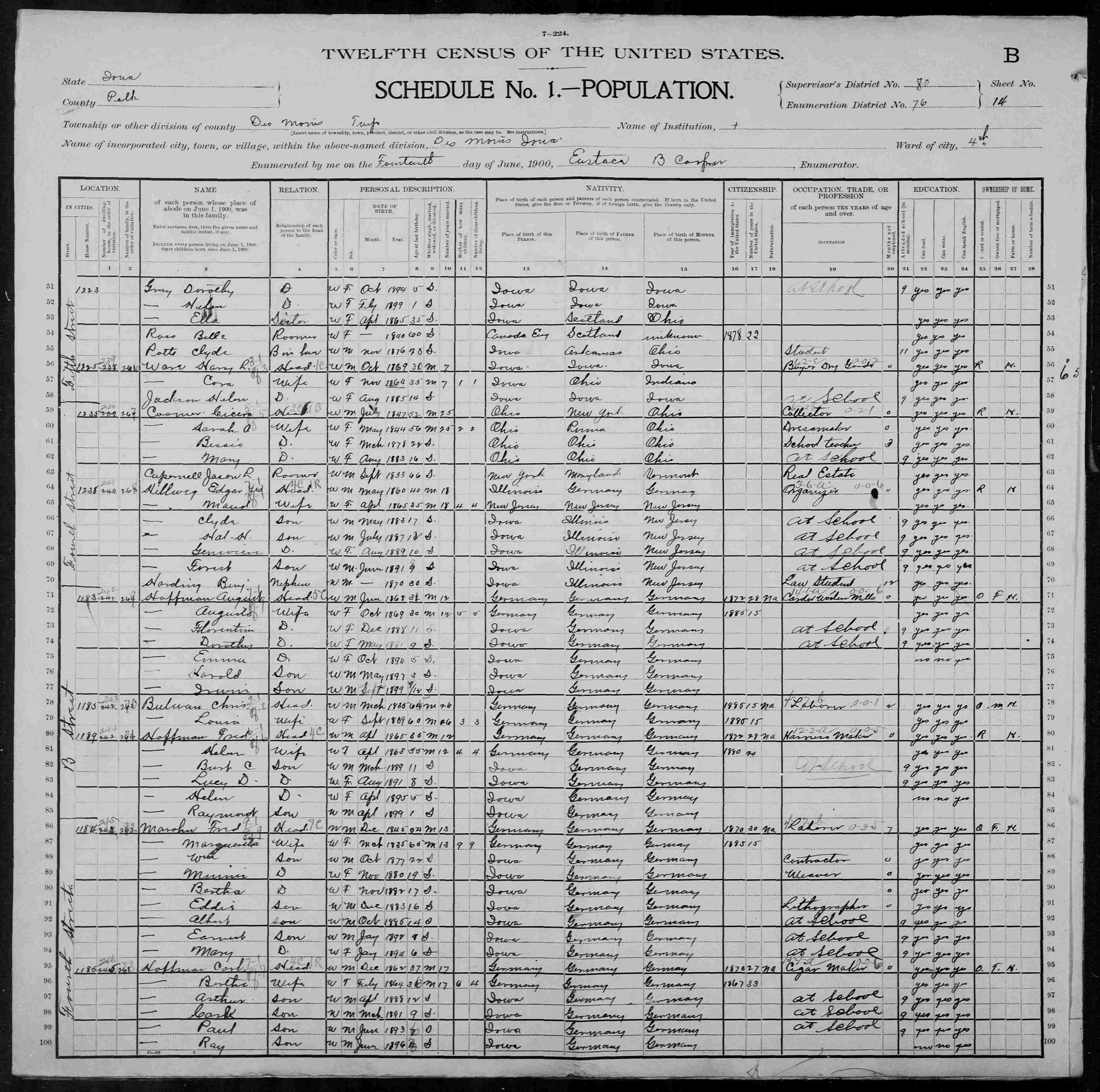 8055. “United States Census,” 1900, IA, Polk, Des Moines, Ward 4, 14B, 80, 76, T623, 1240454, 319, Bureau of the Census, US Dept. of Commerce, United States of America, June 14, 1900, Eustace B Cooper.