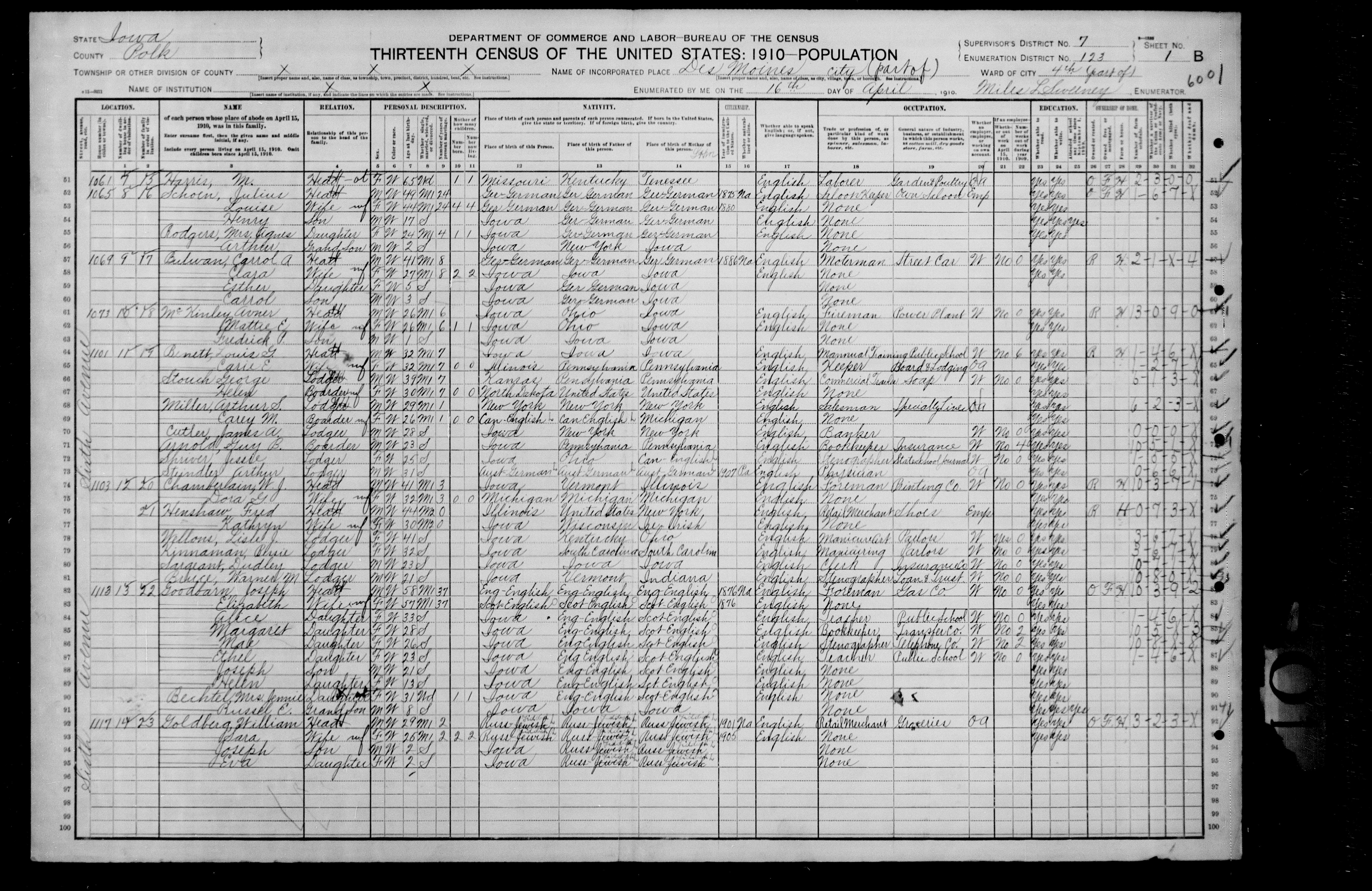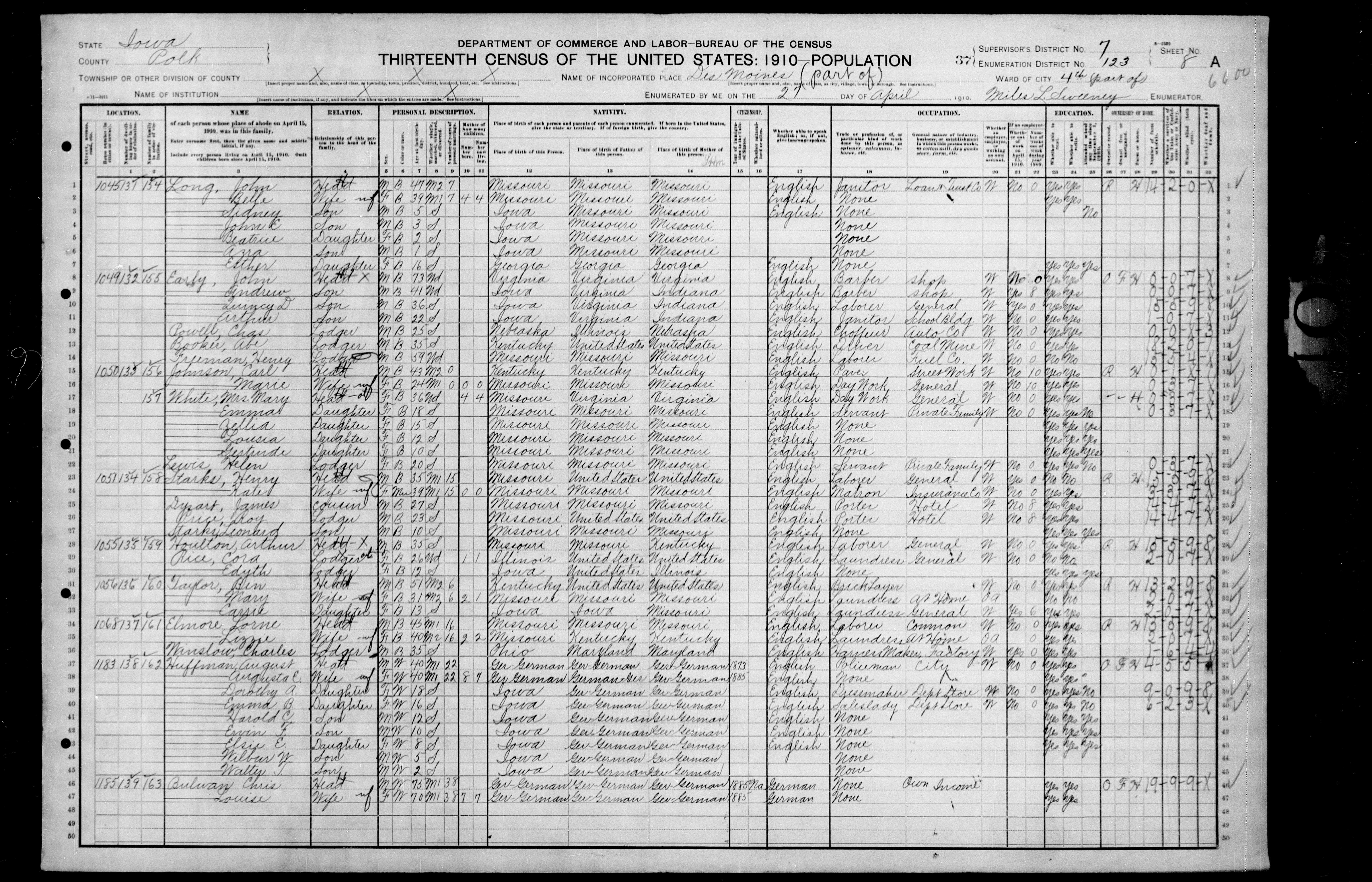 8067. “United States Census,” 1910, IA, Polk, Des Moines, Ward 4, 1B, 7, 123, T624, 67, Bureau of the Census, US Dept. of Commerce, United States of America, April 16, 1910, Miles L Sweeney.
