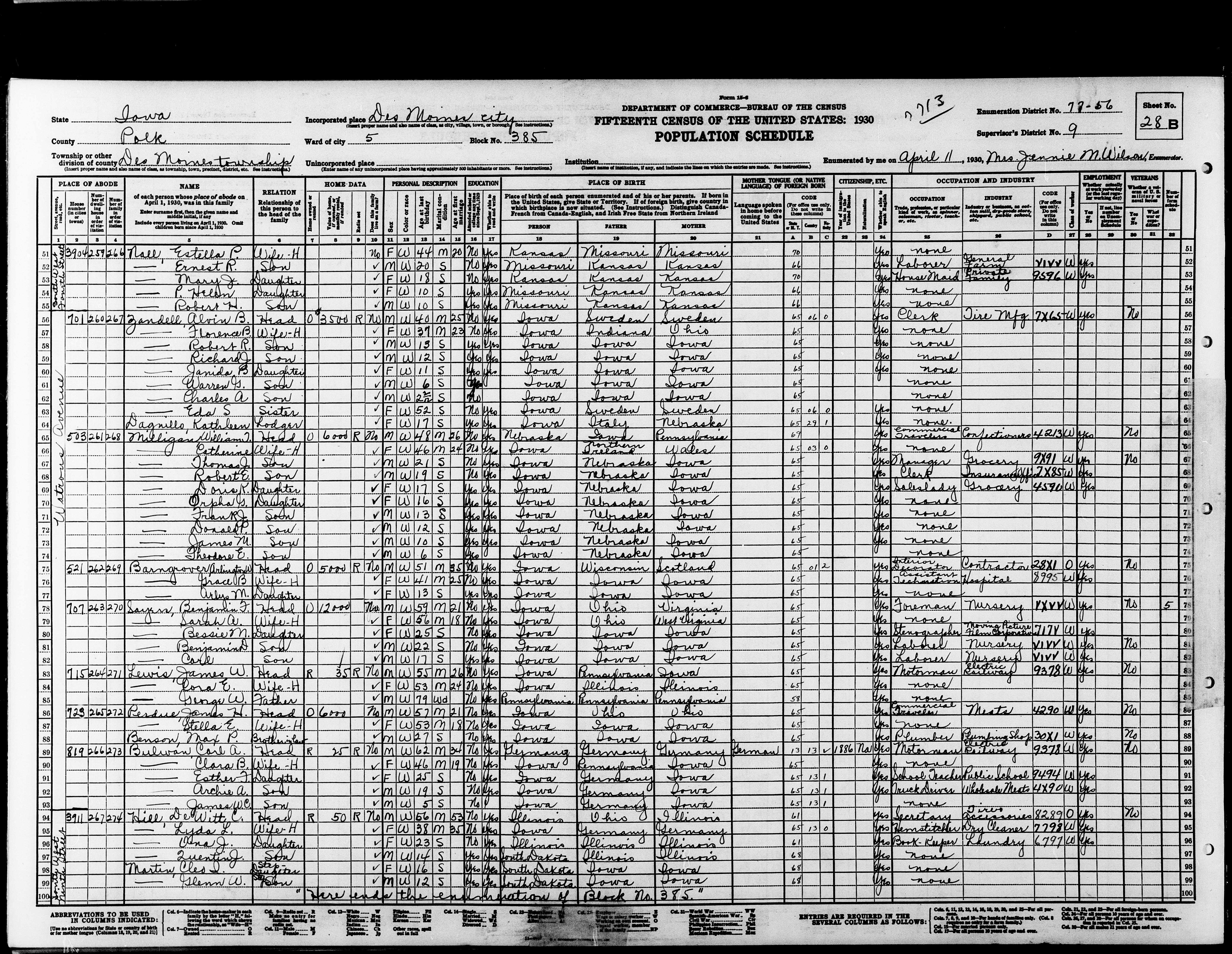 8070. “United States Census,” 1930, IA, Polk, Des Moines, Ward 5, 28B, 9, 77-56, T626, 132, Bureau of the Census, US Dept. of Commerce, United States of America, April 11, 1930, Jennie M Wilson.