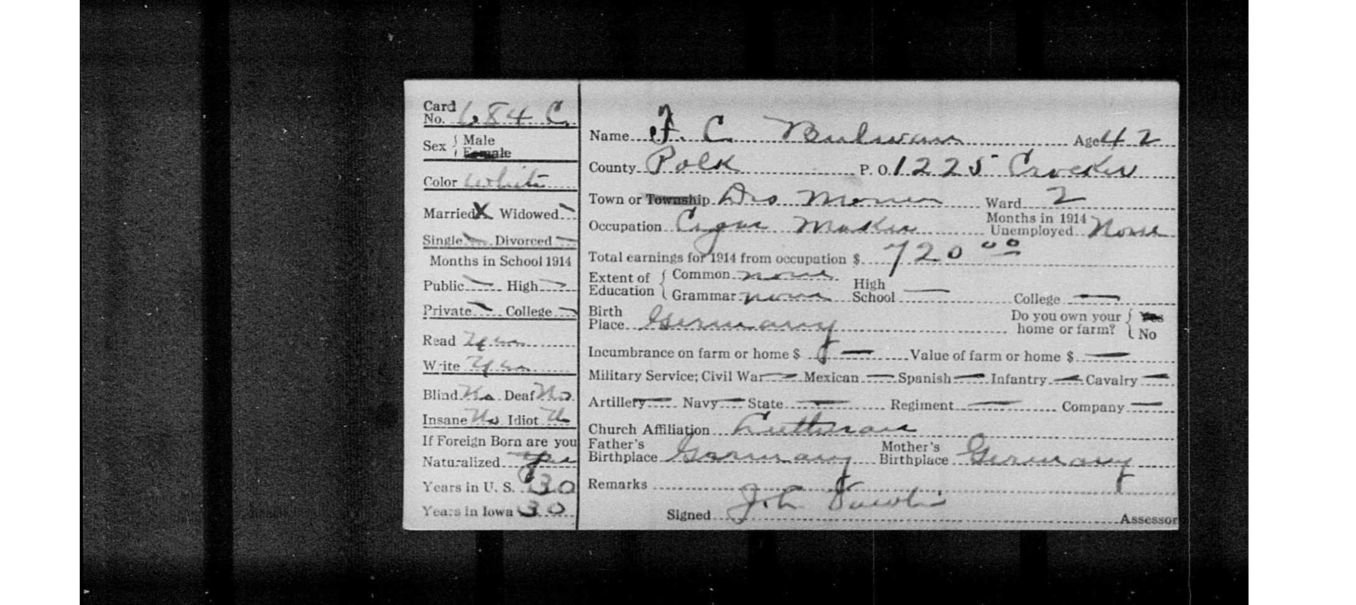 8073. “Iowa State Census,” 1915, IA, Polk, Des Moines, Ward 2, 684 C, Iowa State Historical Department.