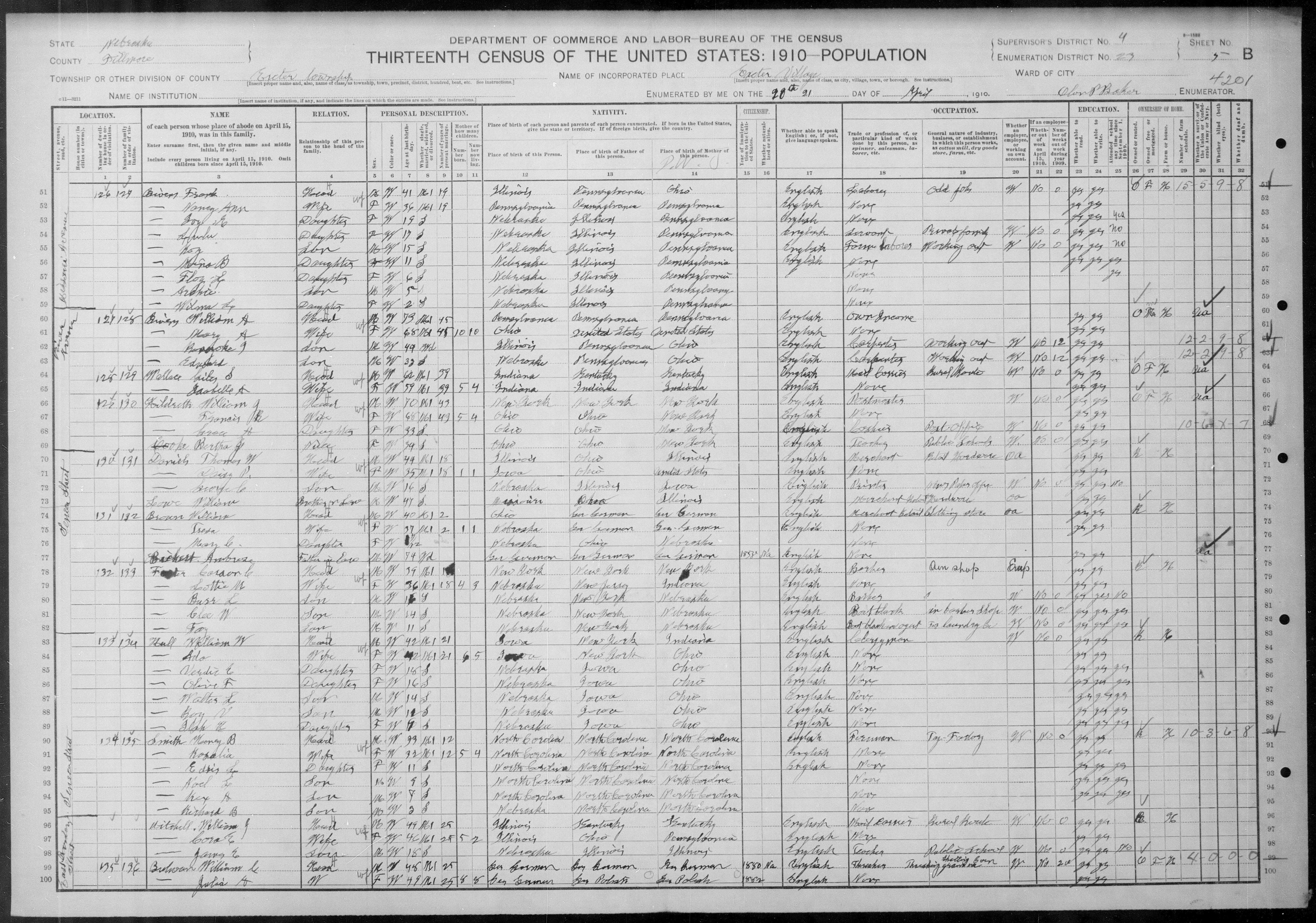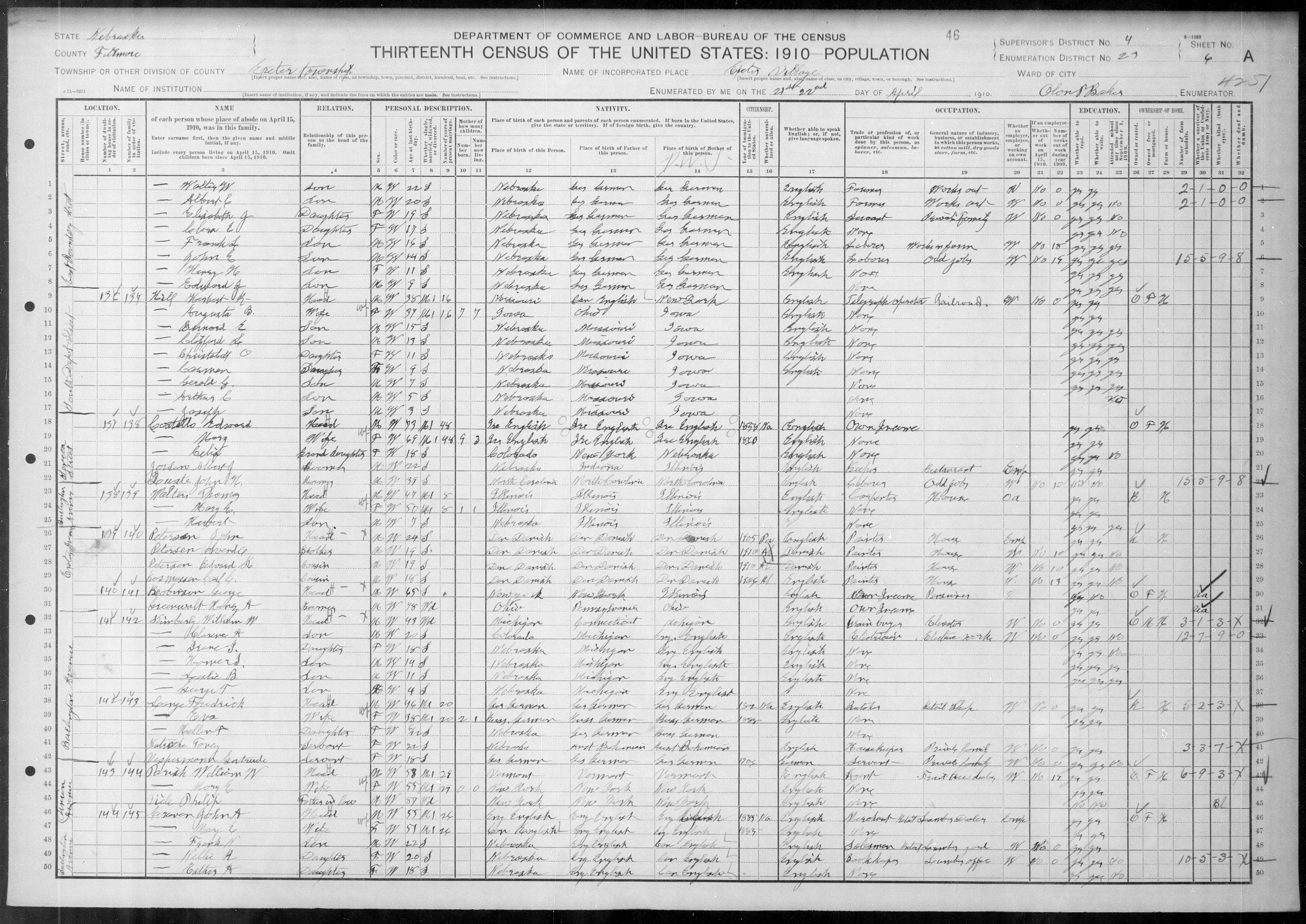 8077. “United States Census,” 1910, NE, Fillmore, Exeter, 5B-6A, 4, 23, T624, 1097, Bureau of the Census, US Dept. of Commerce, United States of America, April 21, 1910, Glen P Baker.