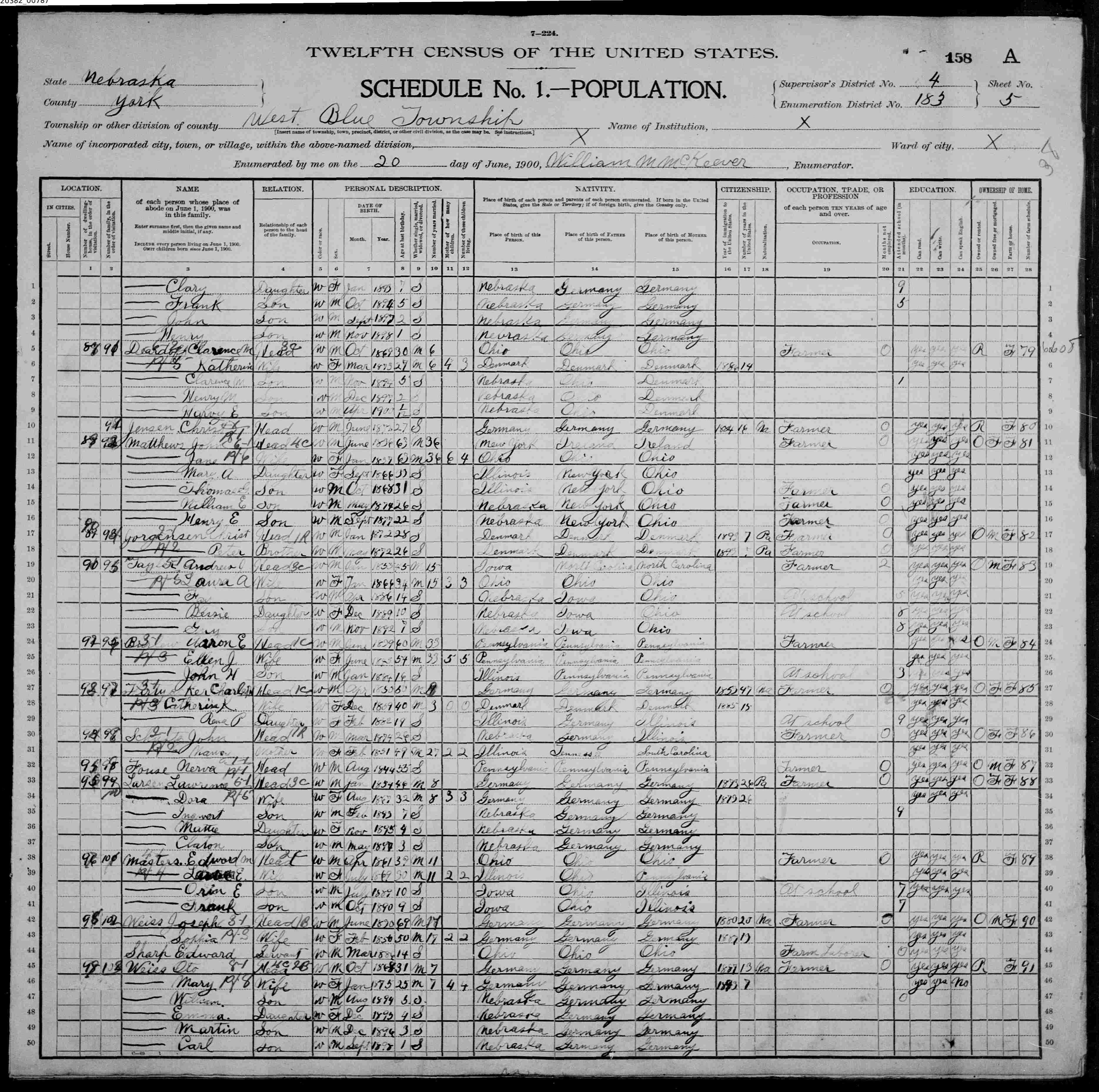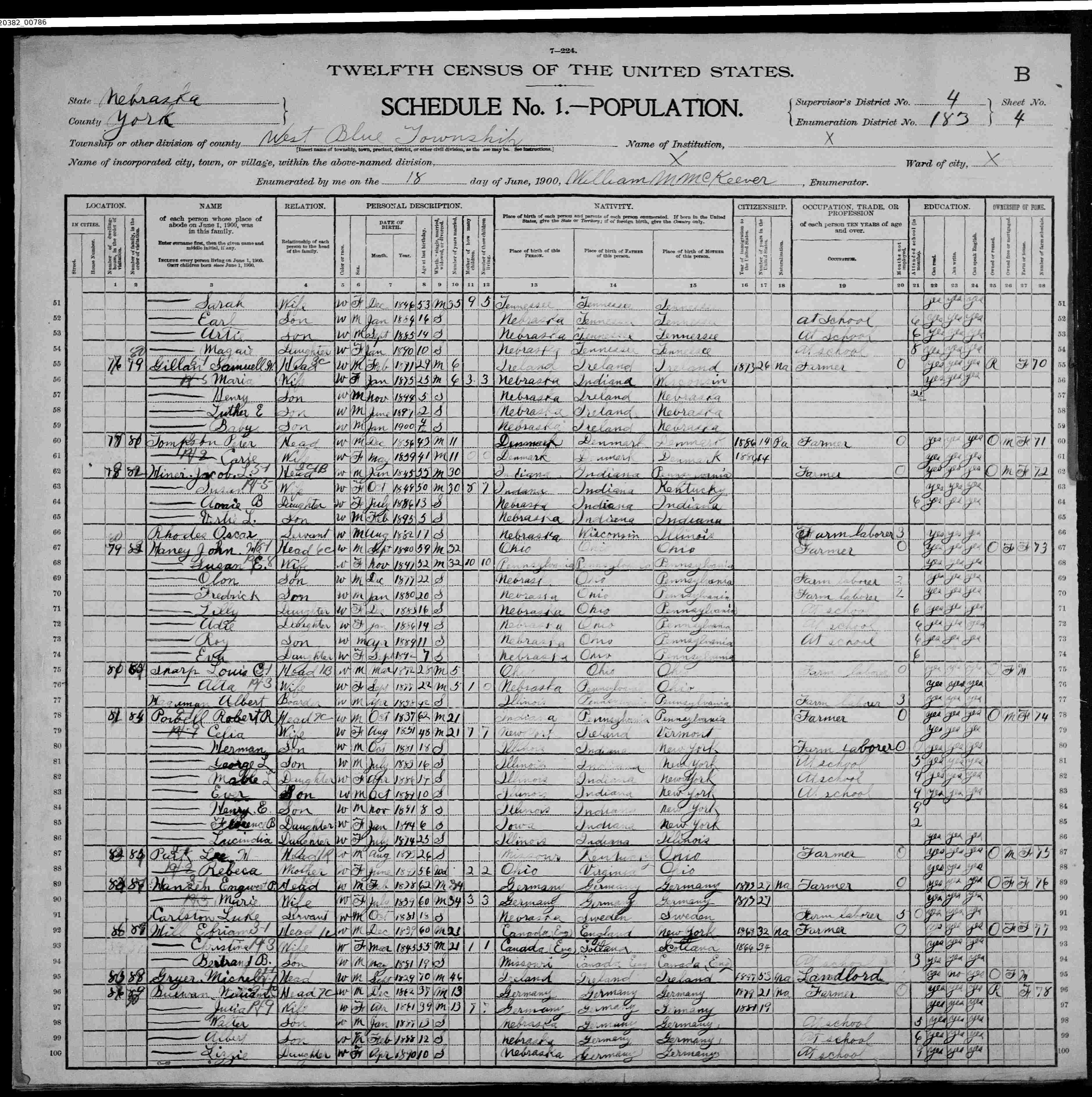 8078. “United States Census,” 1900, NE, York, West Blue, 4B-5A, 4, 183, T623, 1240942, 786, Bureau of the Census, US Dept. of Commerce, United States of America, June 18, 1900, William M McKeever.
