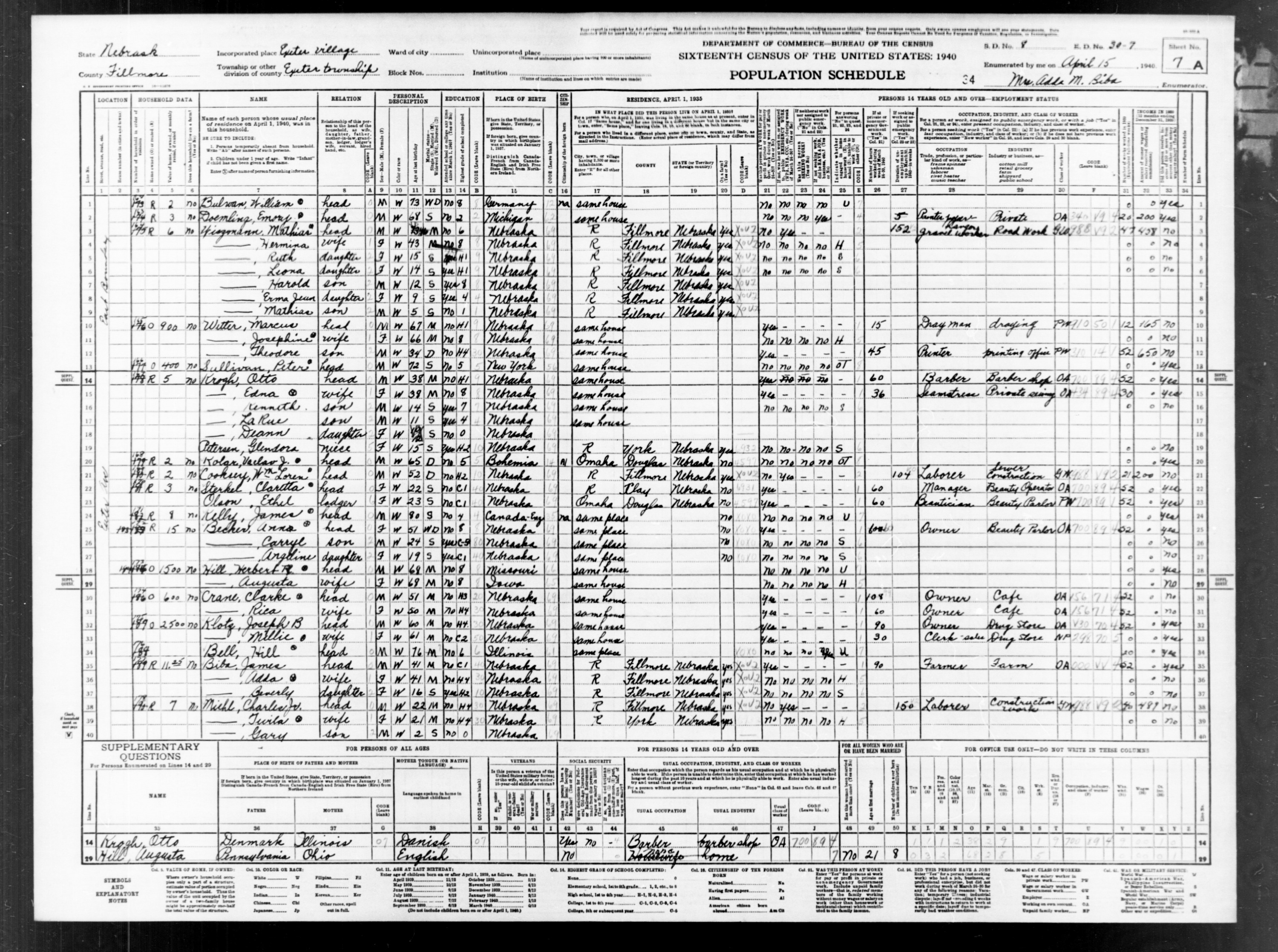 8080. “United States Census,” 1940, NE, Fillmore, Exeter, 7A, 8, 30-7, T627, m-t0627-02245 , Bureau of the Census, US Dept. of Commerce, United States of America, April 15, 1940, Adda M Biba.