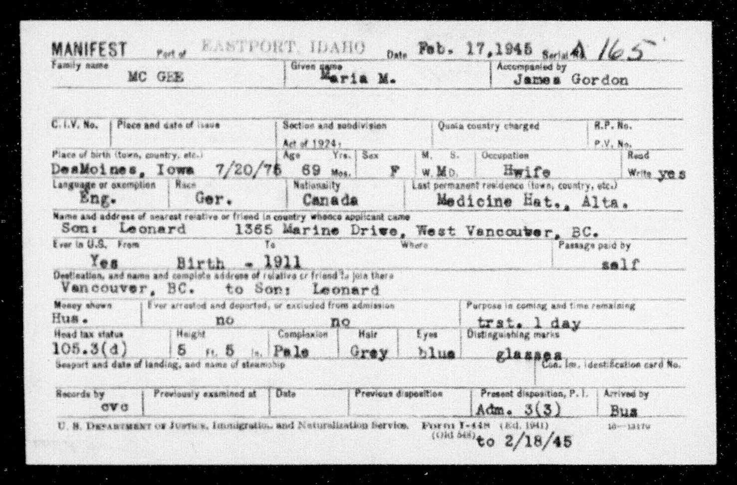 8084. Maria M McGee, “Idaho, Eastport, Arrival Manifests, 1924-1956,” February 17, 1945, Eastport, ID, Says born in Des Moines, IA, but actually born in Germany.