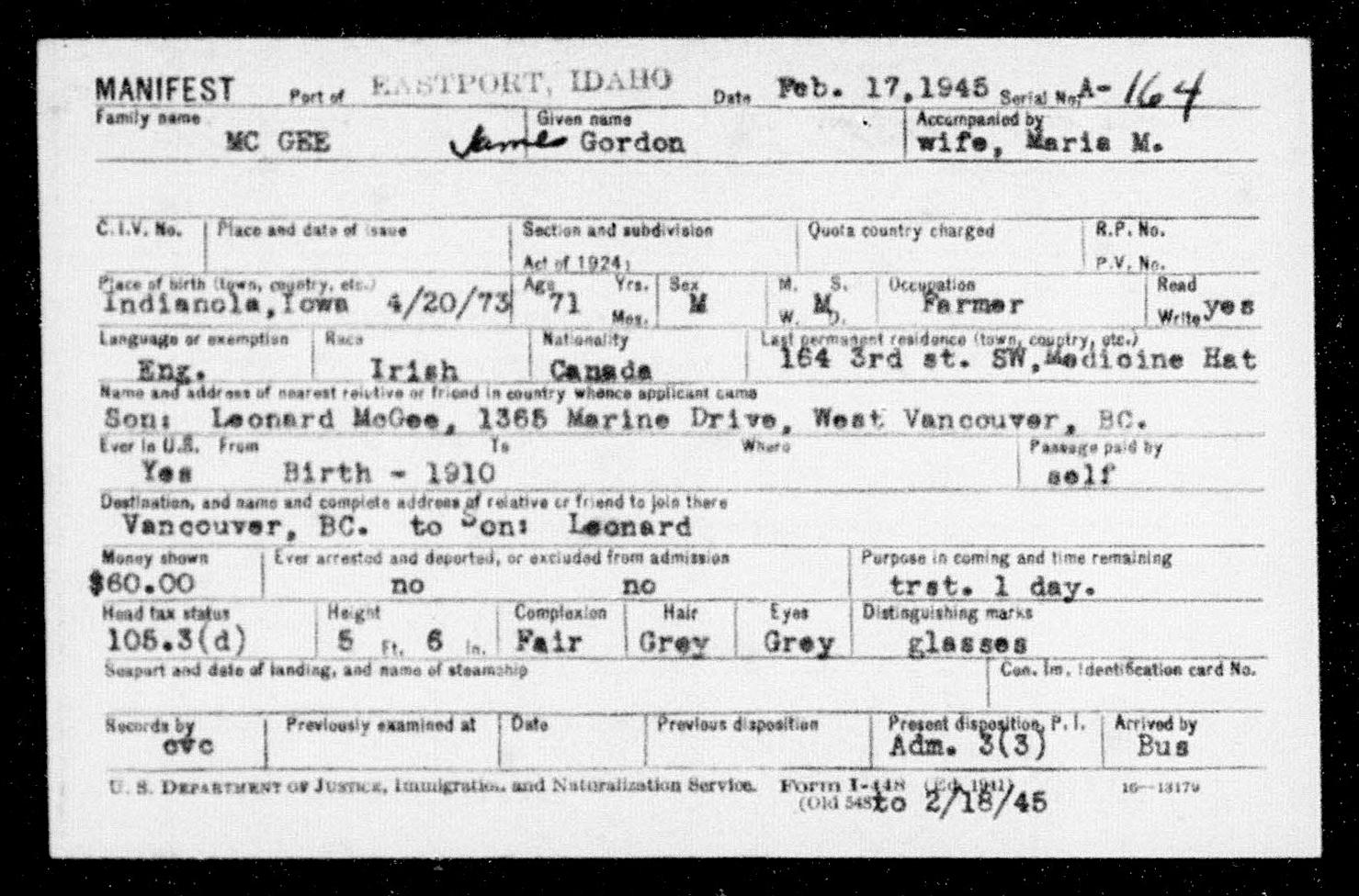 8086. James Gordon McGee, “Idaho, Eastport, Arrival Manifests, 1924-1956,” February 17, 1945, Eastport, ID, https://familysearch.org/ark:/61903/1:1:KF68-J1P.