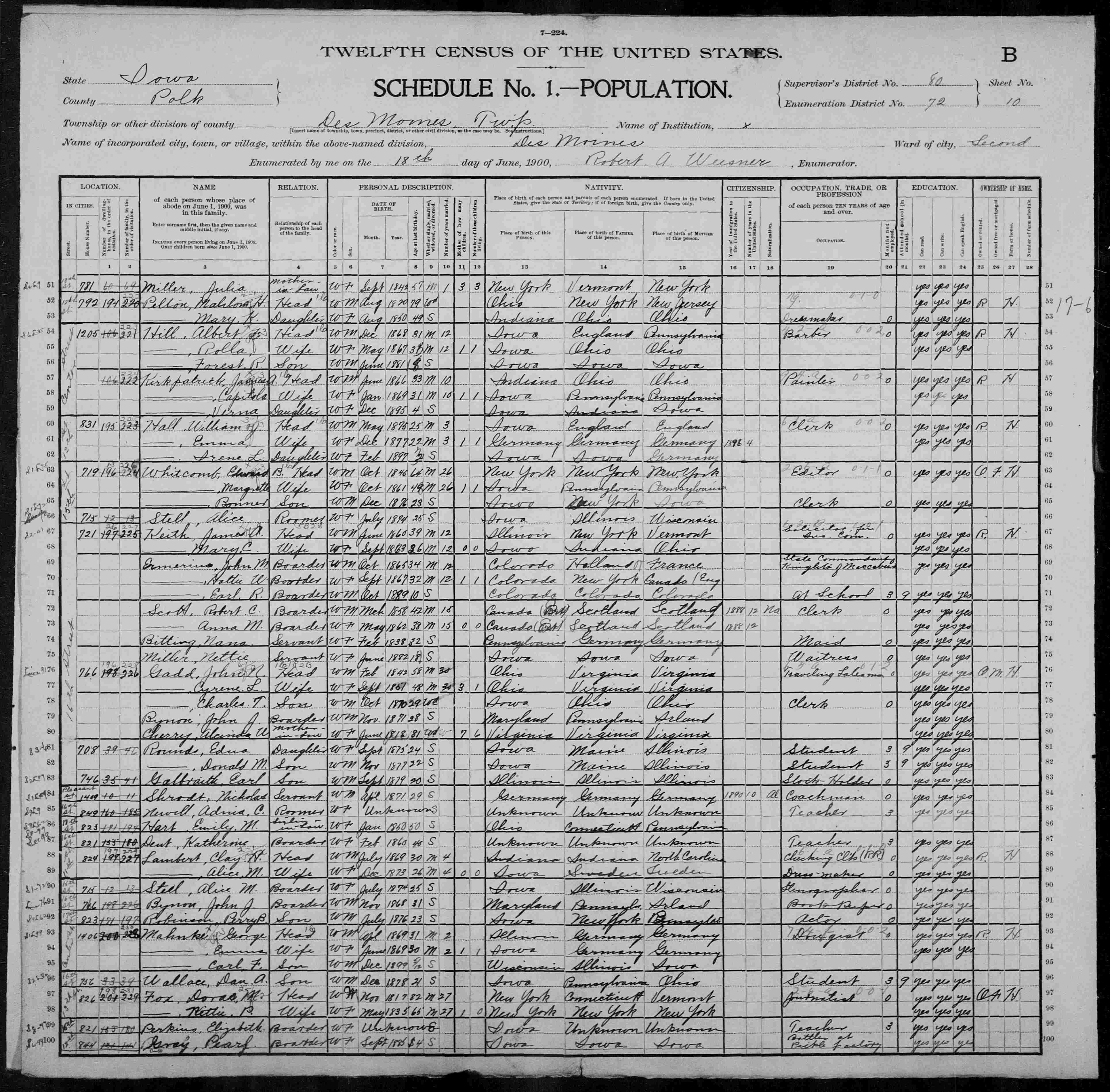 8090. “United States Census,” 1900, IA, Polk, Des Moines, Ward 2, 10B, 80, 72, T623, 1240453, 319, Bureau of the Census, US Dept. of Commerce, United States of America, June 18, 1900, Robert A Weesner.