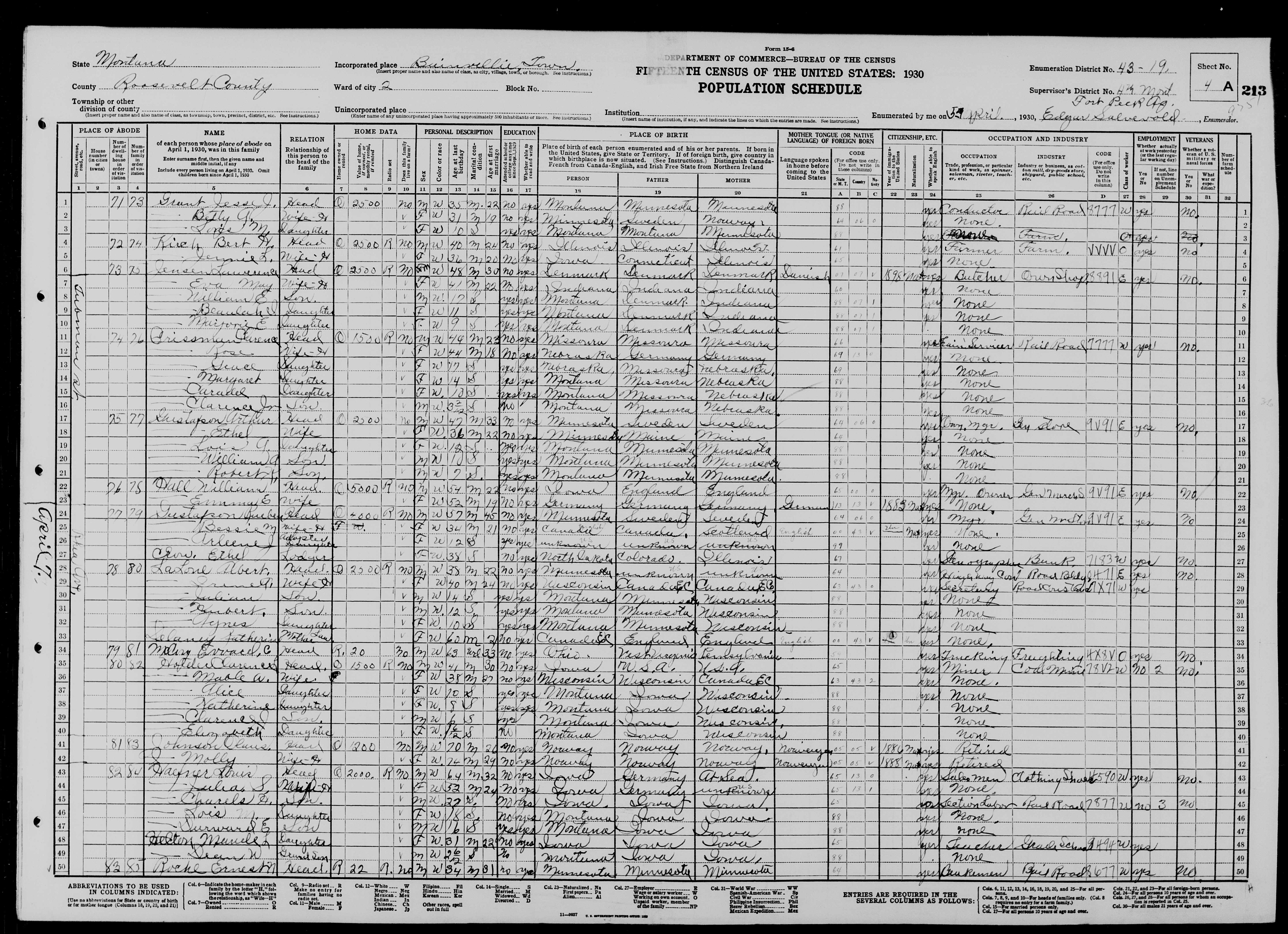 8093. “United States Census,” 1930, MT, Roosevelt, Bainville, Ward 2, 4A, 4, 43-19, T626, 1261, 432, Bureau of the Census, US Dept. of Commerce, United States of America, April 5, 1930, Edgar Salvevold.
