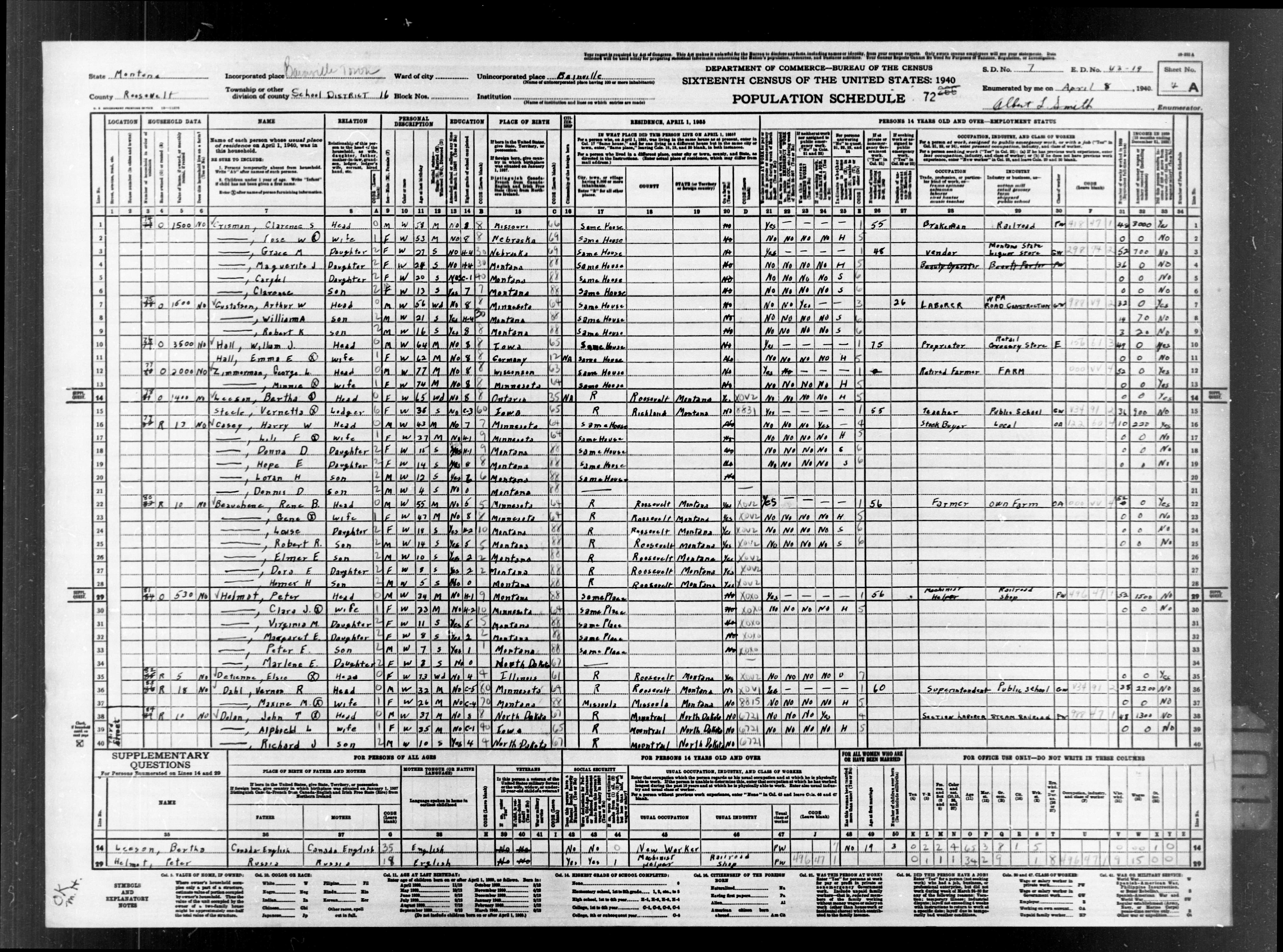 8094. “United States Census,” 1940, MT, Roosevelt, Bainville, District 16, 4A, 7, 43-19, T627, 2228, 650, Bureau of the Census, US Dept. of Commerce, United States of America, April 8, 1940, Albert L Smith.