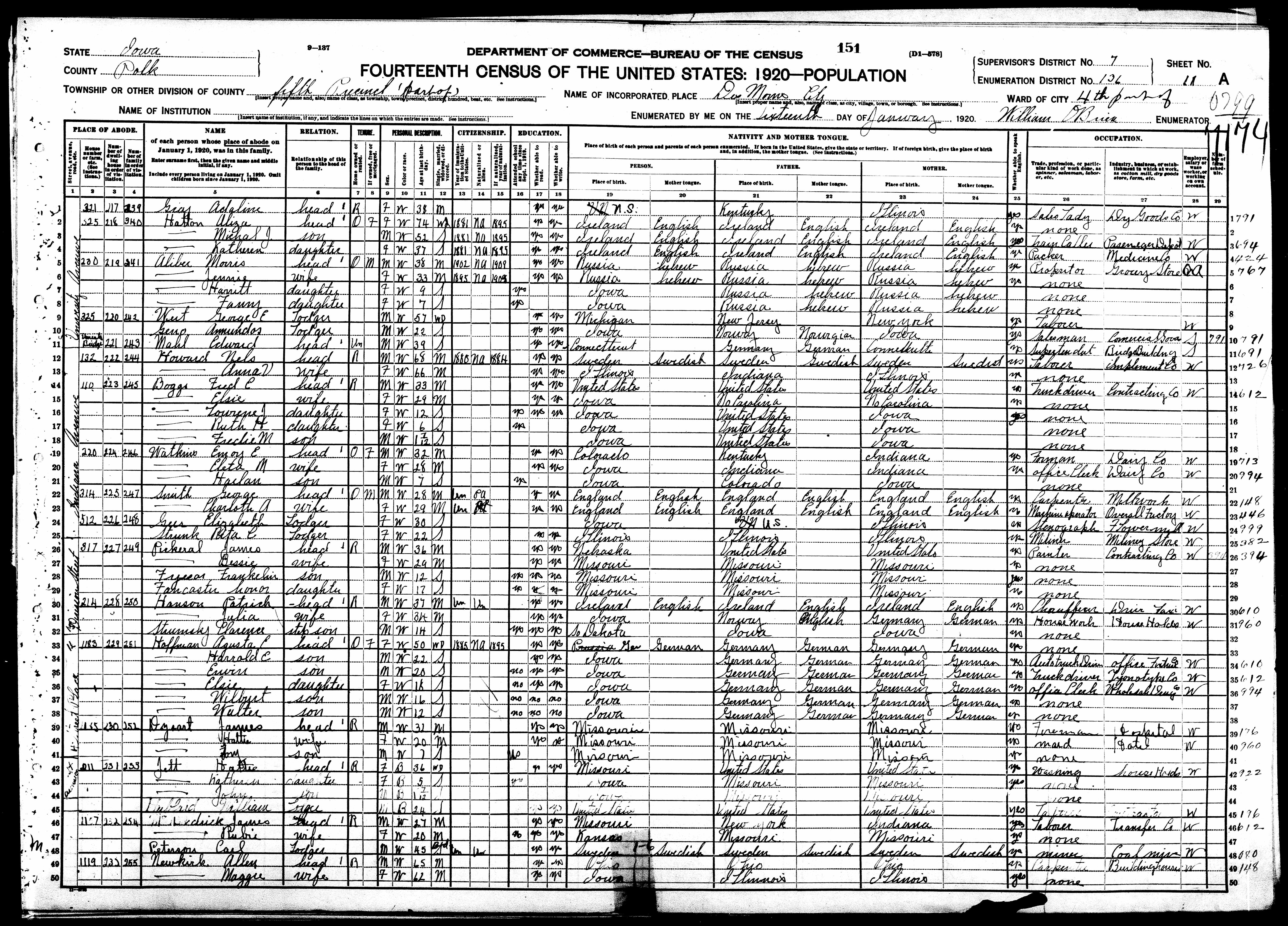 8099. “United States Census,” 1920, IA, Polk, Des Moines, Ward 4, Precinct 5, 11A, 7, 136, T625, 509, 306, Bureau of the Census, US Dept. of Commerce, United States of America, January 16, 1920, William O’Brien.
