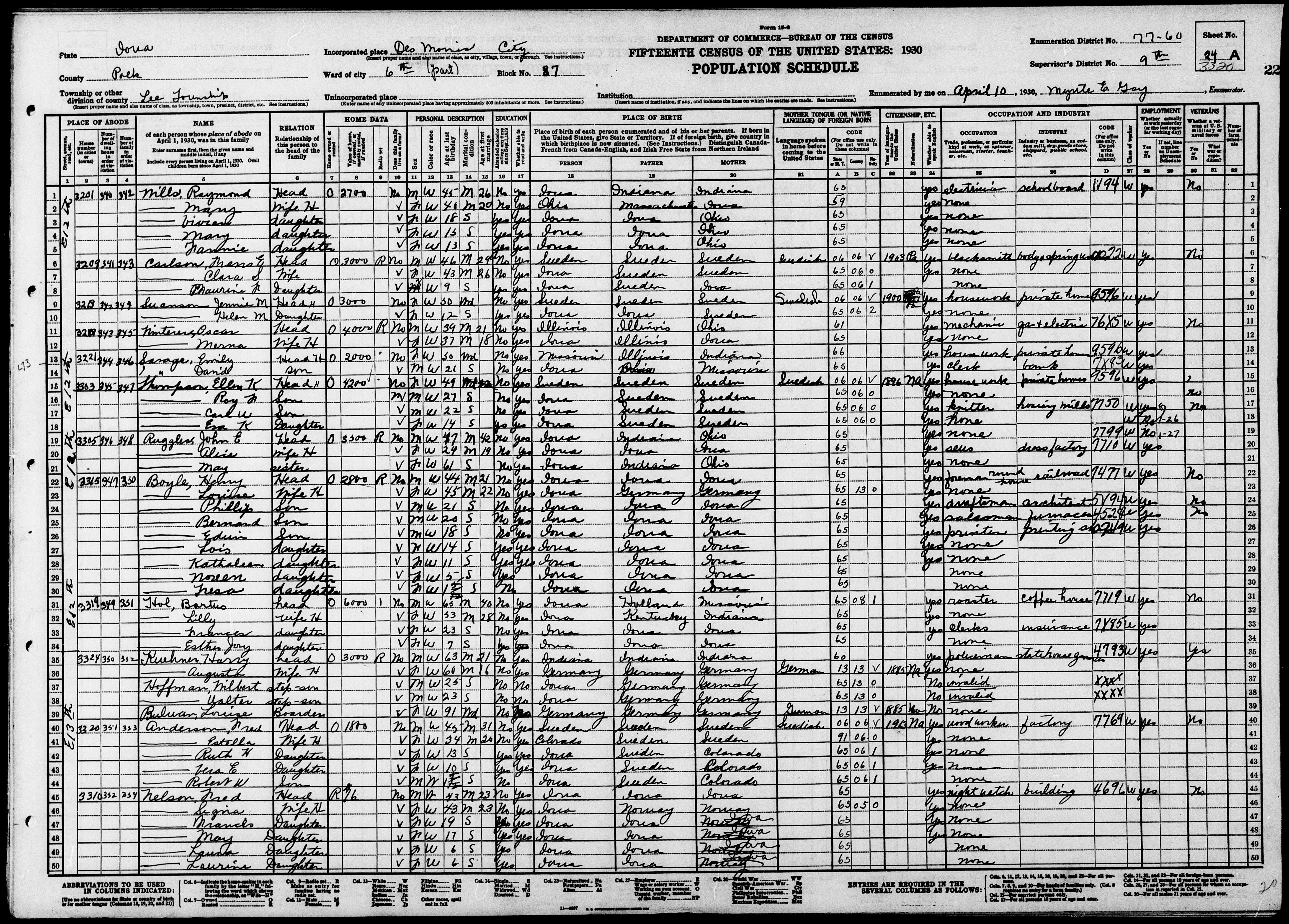 8091. “United States Census,” 1910, IA, Polk, Des Moines, Ward 6, 15B, 7, 148, T624, 684, Bureau of the Census, US Dept. of Commerce, United States of America, April 29, 1910, Chris G Sandelin.