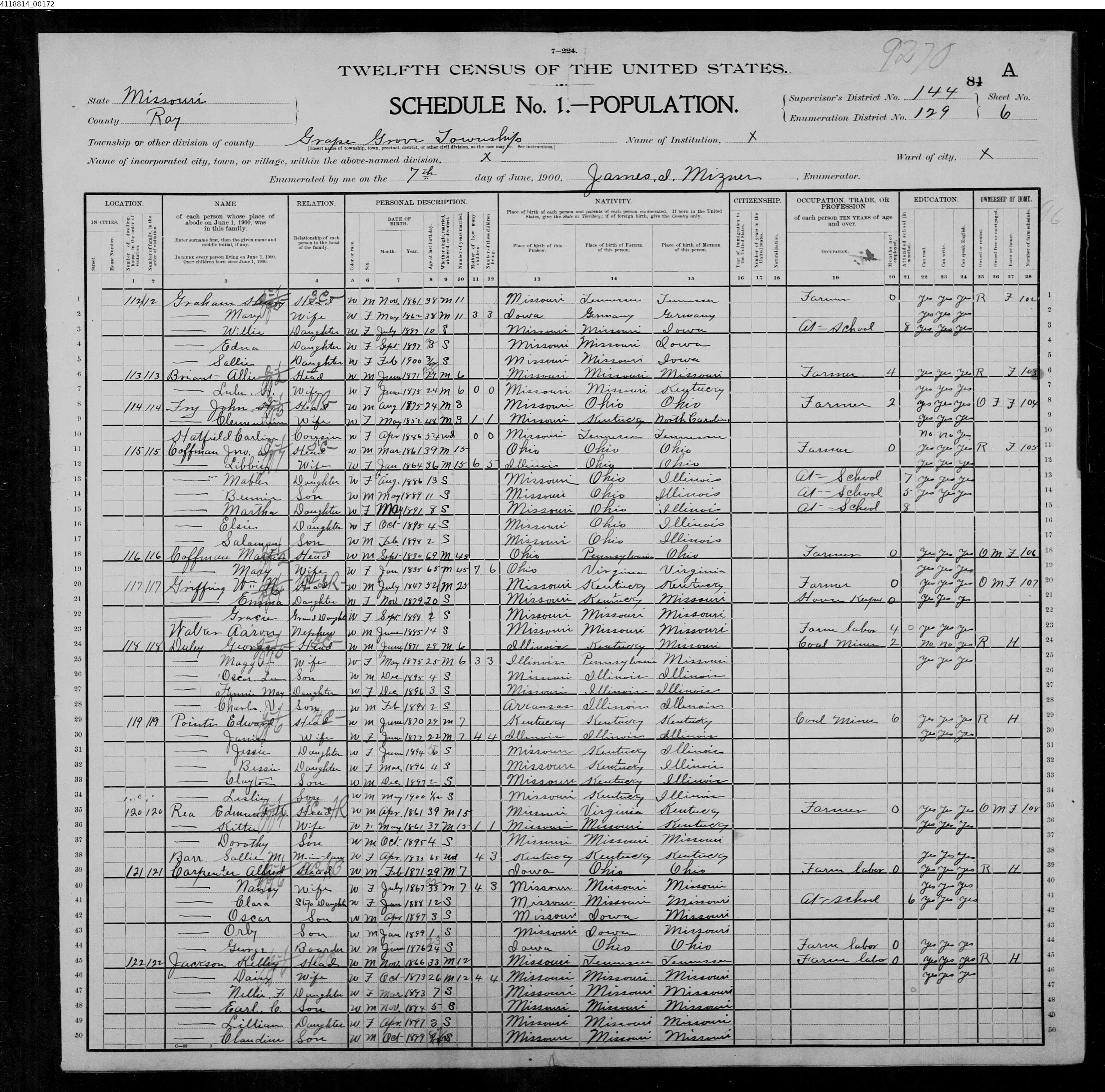 8151. “United States Census,” 1900, MO, Ray, Grape Grove, 6A, 144, 129, T623, 1240885, 172, Bureau of the Census, US Dept. of Commerce, United States of America, June 7, 1900, James I Mizner.