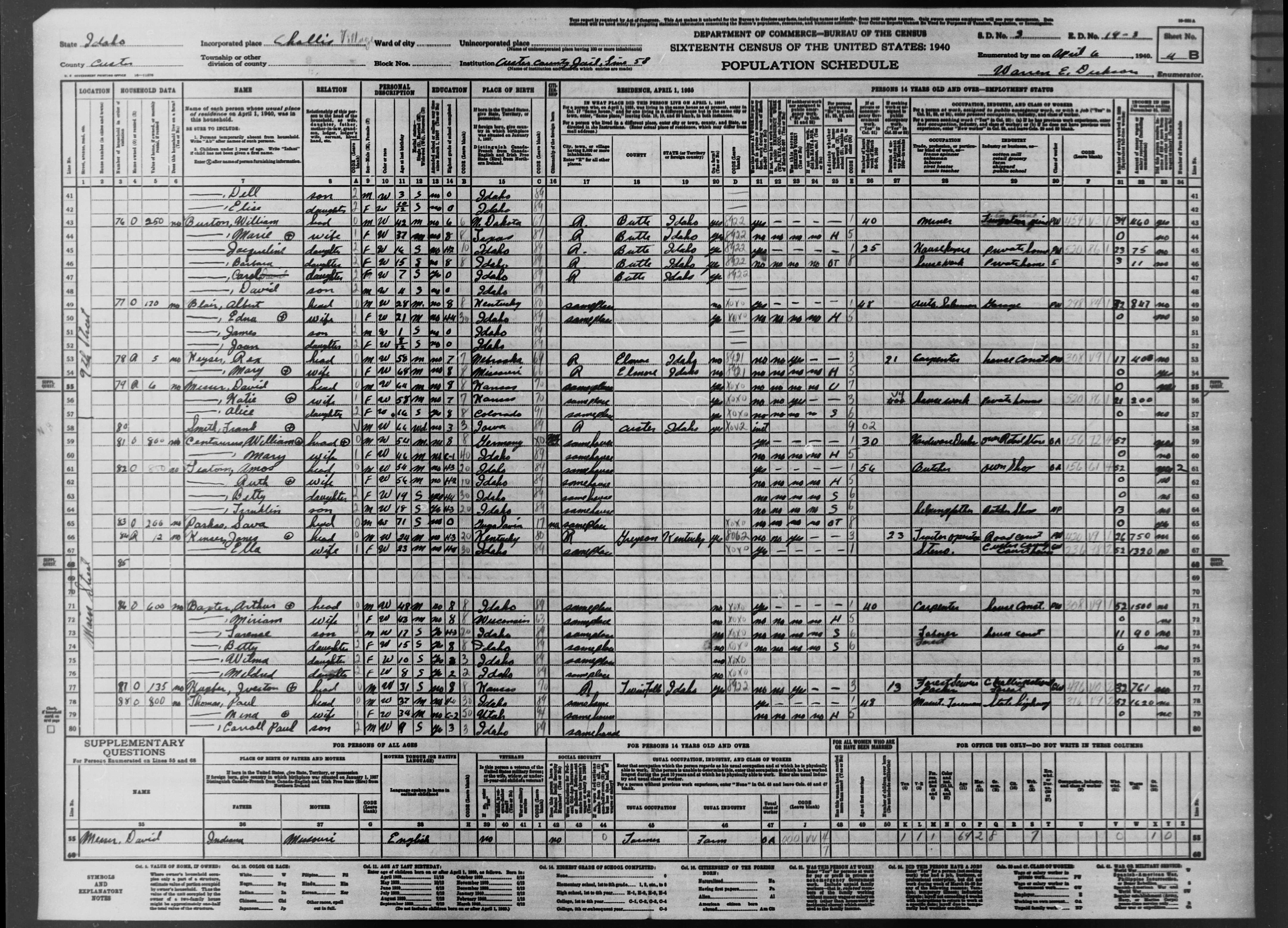 8162. “United States Census,” 1940, ID, Custer, Challis, 4B, 3, 19-3, T627, 744, 945, Bureau of the Census, US Dept. of Commerce, United States of America, April 6, 1940, Warren E Dickson.