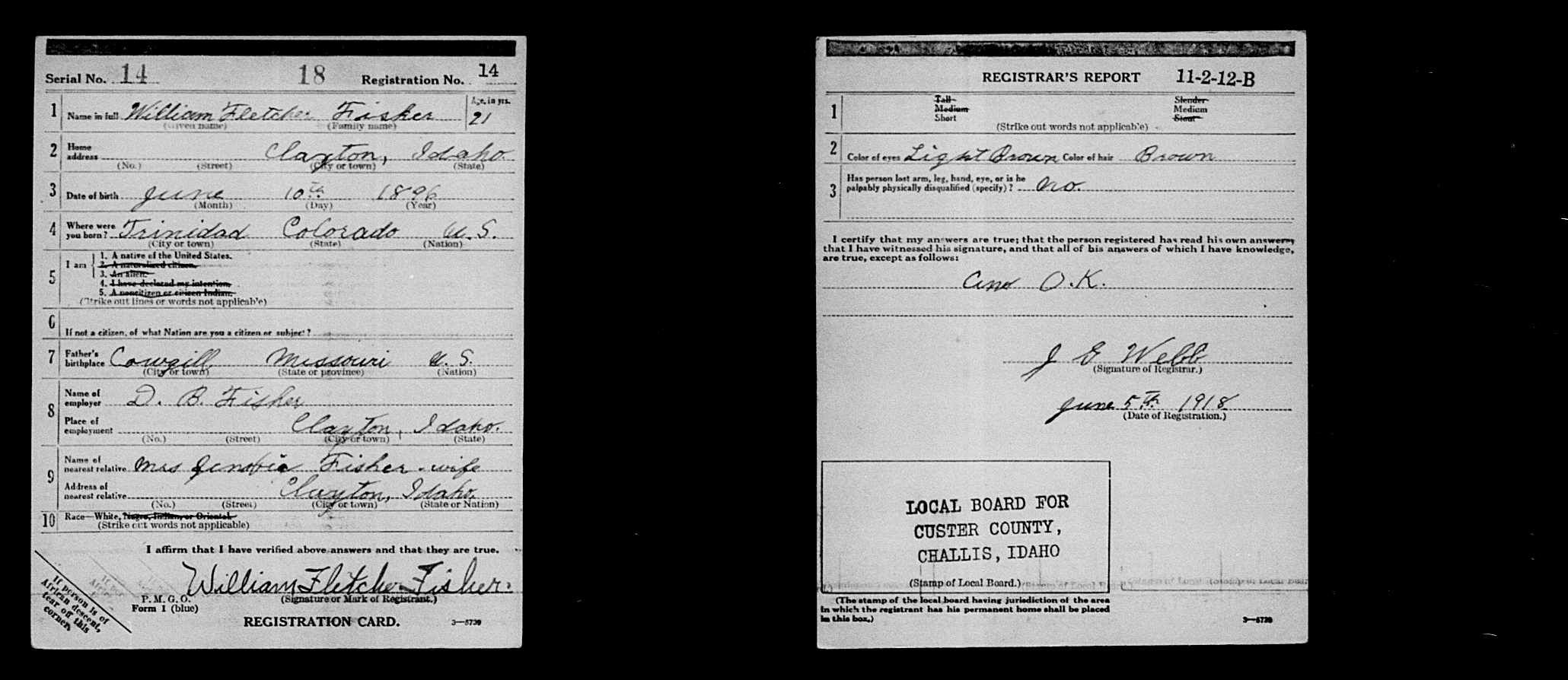 8164. World War I, 1918, Idaho, 14, Fisher, William Fletcher, “World War I Selective Service System Draft Registration Cards,” June 5, 1918, Custer County, ID, https://familysearch.org/ark:/61903/1:1:K8QZ-4K6.