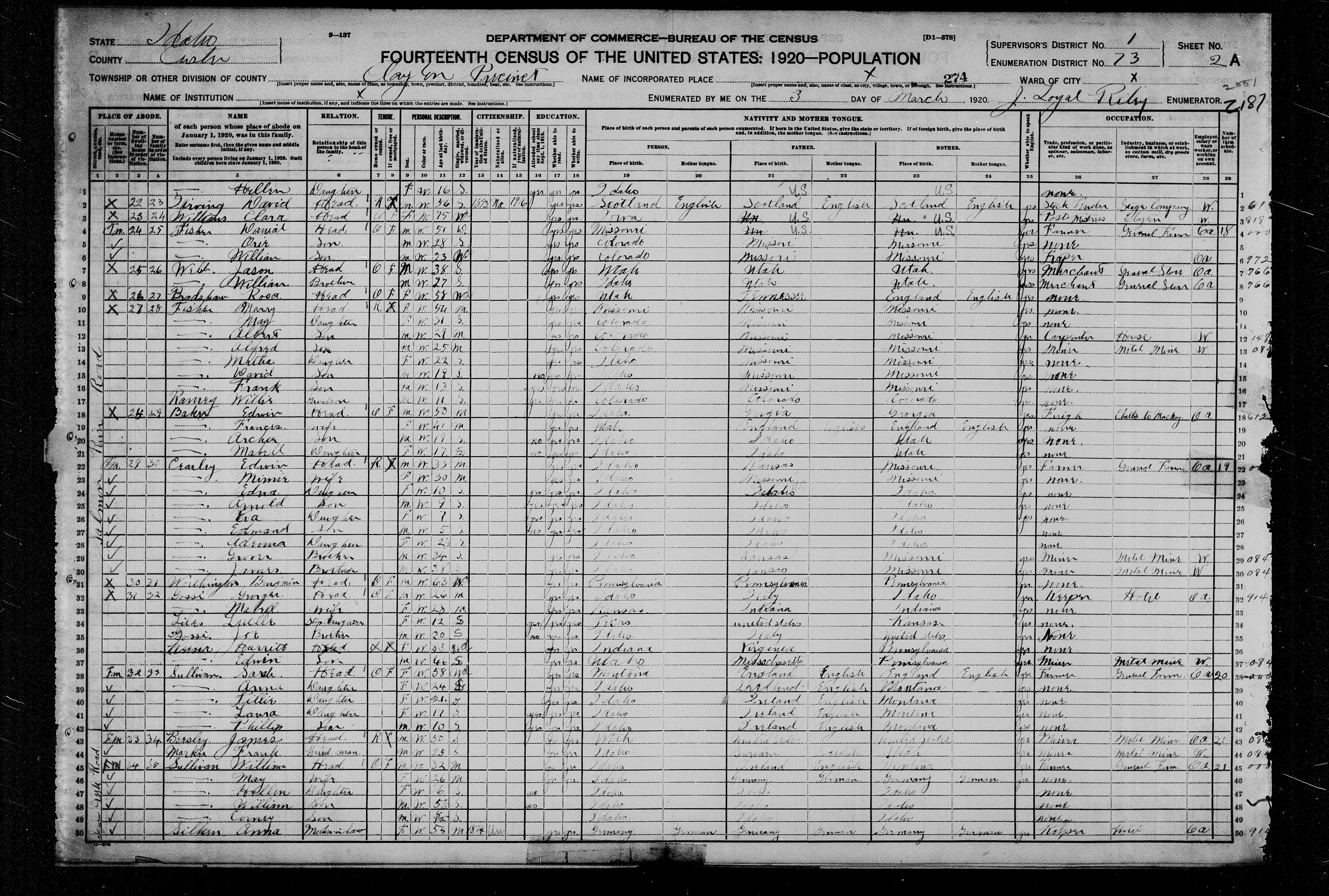 8168. “United States Census,” 1920, ID, Custer, Clayton, 2A, 1, 73, T625, 290, 1132, Bureau of the Census, US Dept. of Commerce, United States of America, March 3, 1920, J Loyal Riley.
